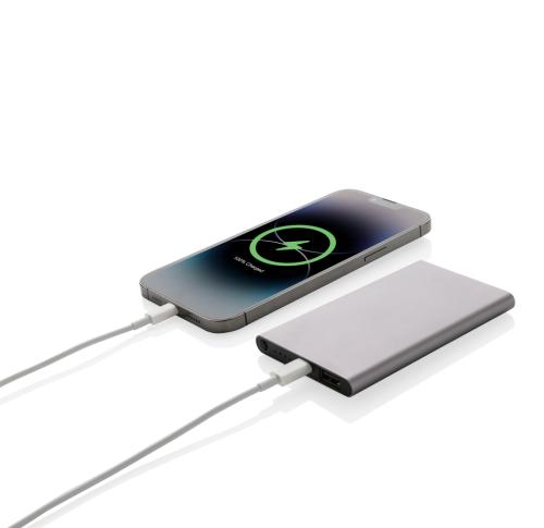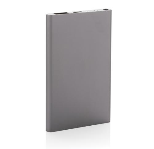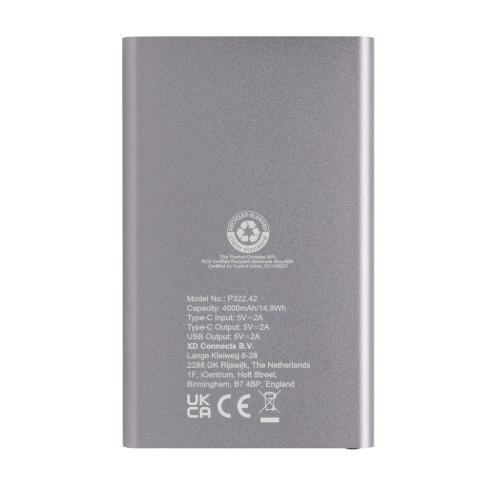 4.000 mAh flat design powerbank with a the case made out of RCS certified recycled Aluminum/ABS plastic. RCS (Recycled Claim Standard) is a standard to verify the recycled content of a product throughout the whole supply chain. Total recycled content: 36 % based on total item weight. The powerbank supports both charging via USB A as well as type C. The powerbank contains a long lasting grade A 4.000 mAh lithium polymer battery. The power indicators will indicate the remaining energy level so you always know when to re-charge.; Type-C Input 5V/2A; Type C output:5V/2A USB A output: 5V/2A. Item and accessories PVC free. Including RCS certified recycled TPE charging cable. Packed in FSC® mix packaging.