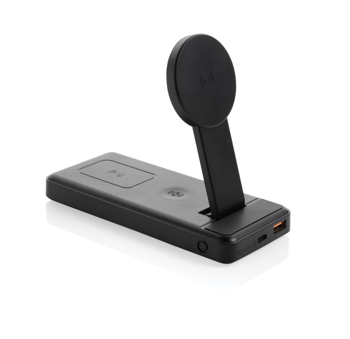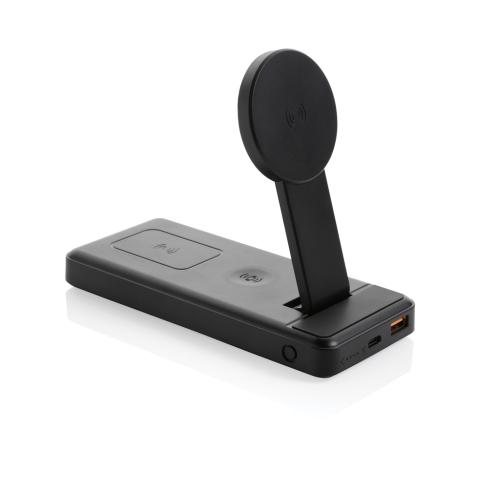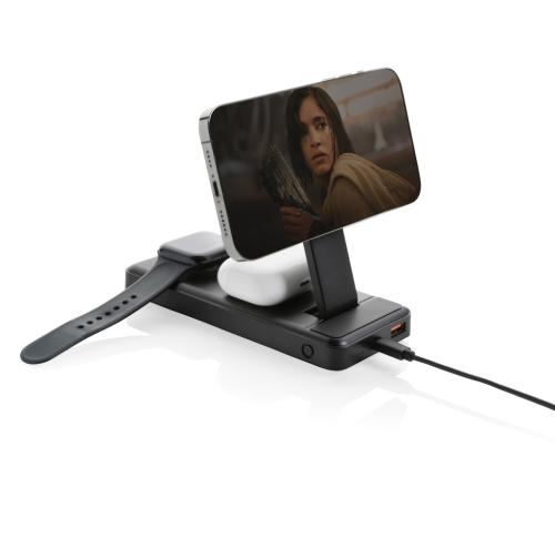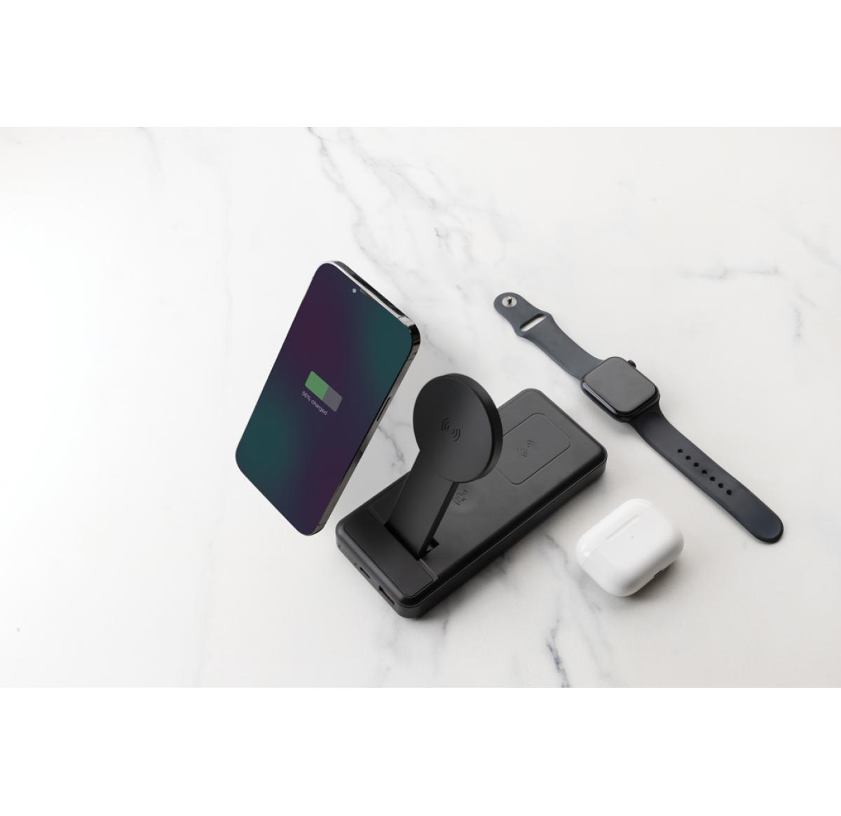 Unique 3 in 1 design 10.000 mAh 15W powerbank with a case made out of RCS certified recycled ABS plastic. RCS (Recycled Claim Standard) is a standard to verify the recycled content of a product throughout the whole supply chain. Total recycled content: 20 % based on total item weight.The powerbank contains a long lasting grade A 10.000 mAh lithium polymer battery. The powerbank has a foldable integrated 15W magnetic wireless charging stand and 5W secondary wireless charger that can be used for smaller wireless items like earbud cases and a third 2.5W watch charger for IOS watches. The power indicators will indicate the remaining energy level so you always know when to re-charge.; item and accessories PVC free. Including RCS certified recycled TPE charging cable. Packed in FSC® mix packaging. Type-C input 5V2.5A 9V2A 12V1.5A; Type-C output?5V3A 9V2.22A 12V1.67A; USB-A output?5V3A 9V2A 12V1.5A 5V4.5A