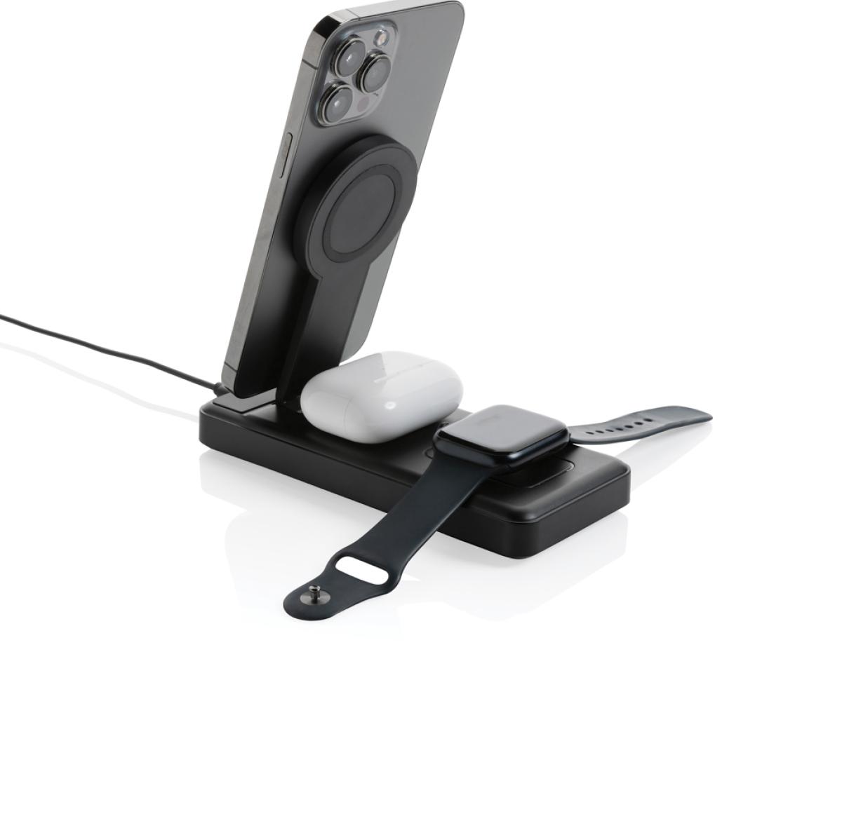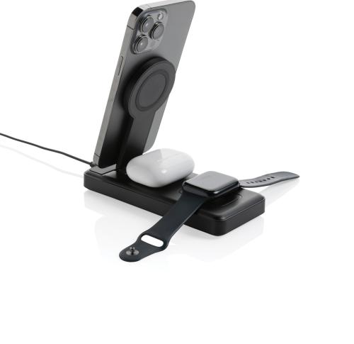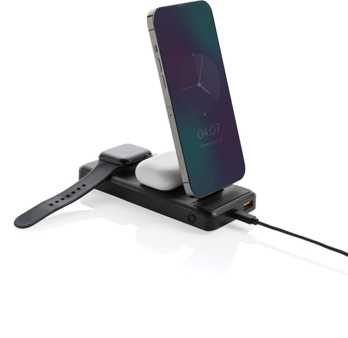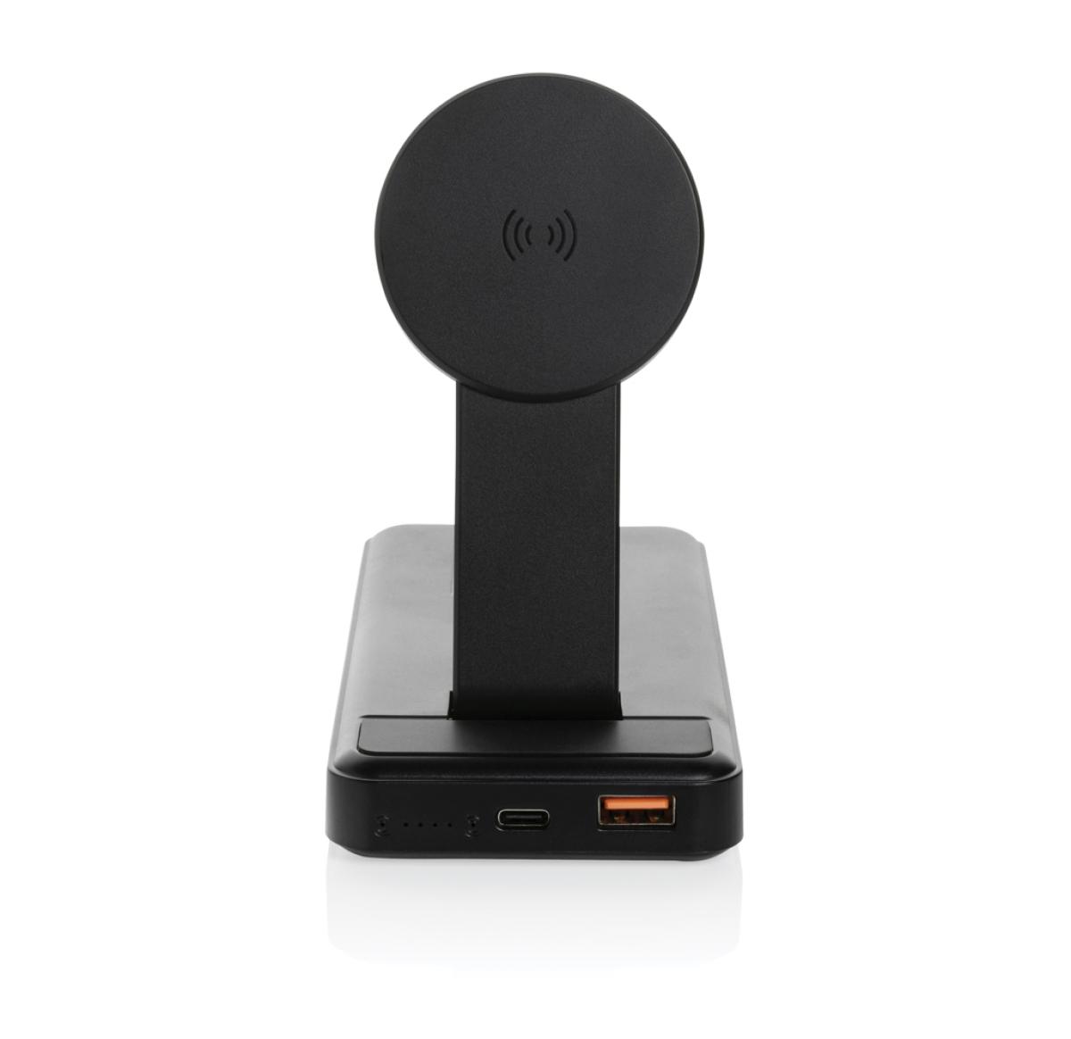 Unique 3 in 1 design 10.000 mAh 15W powerbank with a case made out of RCS certified recycled ABS plastic. RCS (Recycled Claim Standard) is a standard to verify the recycled content of a product throughout the whole supply chain. Total recycled content: 20 % based on total item weight.The powerbank contains a long lasting grade A 10.000 mAh lithium polymer battery. The powerbank has a foldable integrated 15W magnetic wireless charging stand and 5W secondary wireless charger that can be used for smaller wireless items like earbud cases and a third 2.5W watch charger for IOS watches. The power indicators will indicate the remaining energy level so you always know when to re-charge.; item and accessories PVC free. Including RCS certified recycled TPE charging cable. Packed in FSC® mix packaging. Type-C input 5V2.5A 9V2A 12V1.5A; Type-C output?5V3A 9V2.22A 12V1.67A; USB-A output?5V3A 9V2A 12V1.5A 5V4.5A