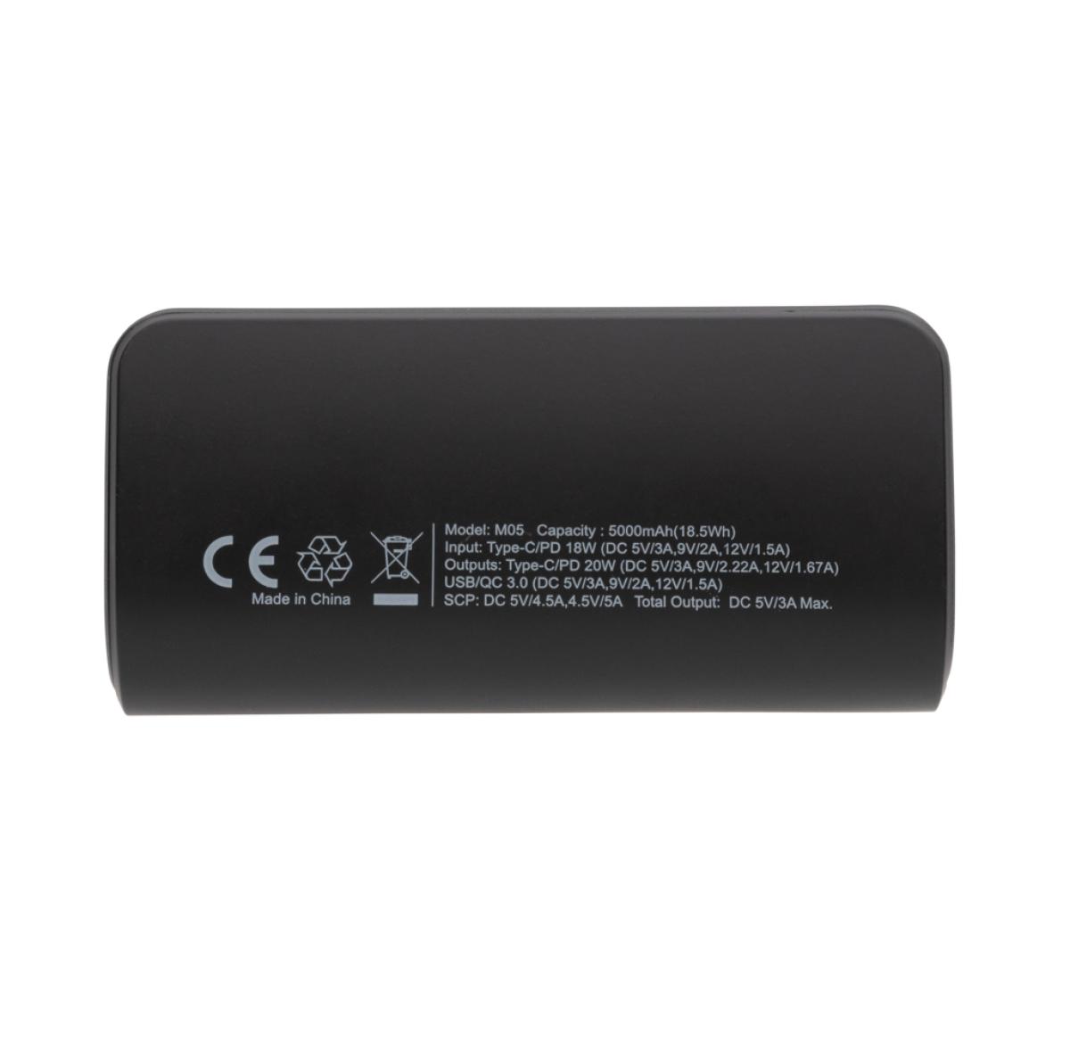 5.000 mAh pocket size 20W PD powerbank where the case is made out of RCS certified recycled ABS plastic. RCS (Recycled Claim Standard) is a standard to verify the recycled content of a product throughout the whole supply chain. Total recycled content: 21 % based on total item weight. With its sleek and space-saving design, Flashcharge is remarkably compact, ensuring you can carry it effortlessly wherever you go. Experience lightning-fast charging for both iOS and Android devices. No more long waiting times; this powerbank ensures your devices reach full power in record time. The powerbank itself supports 18W fast re-charging so the powerbank can re-charged faster than a regular powerbank. Equipped with a Quick Charge 3.0 USB-A port and a 20W PD Type-C port, you can charge multiple devices simultaneously, without compromising on charging speed. Keep track of your power reserve with the integrated LED screen, ensuring you're never caught with a depleted battery when you need it most.