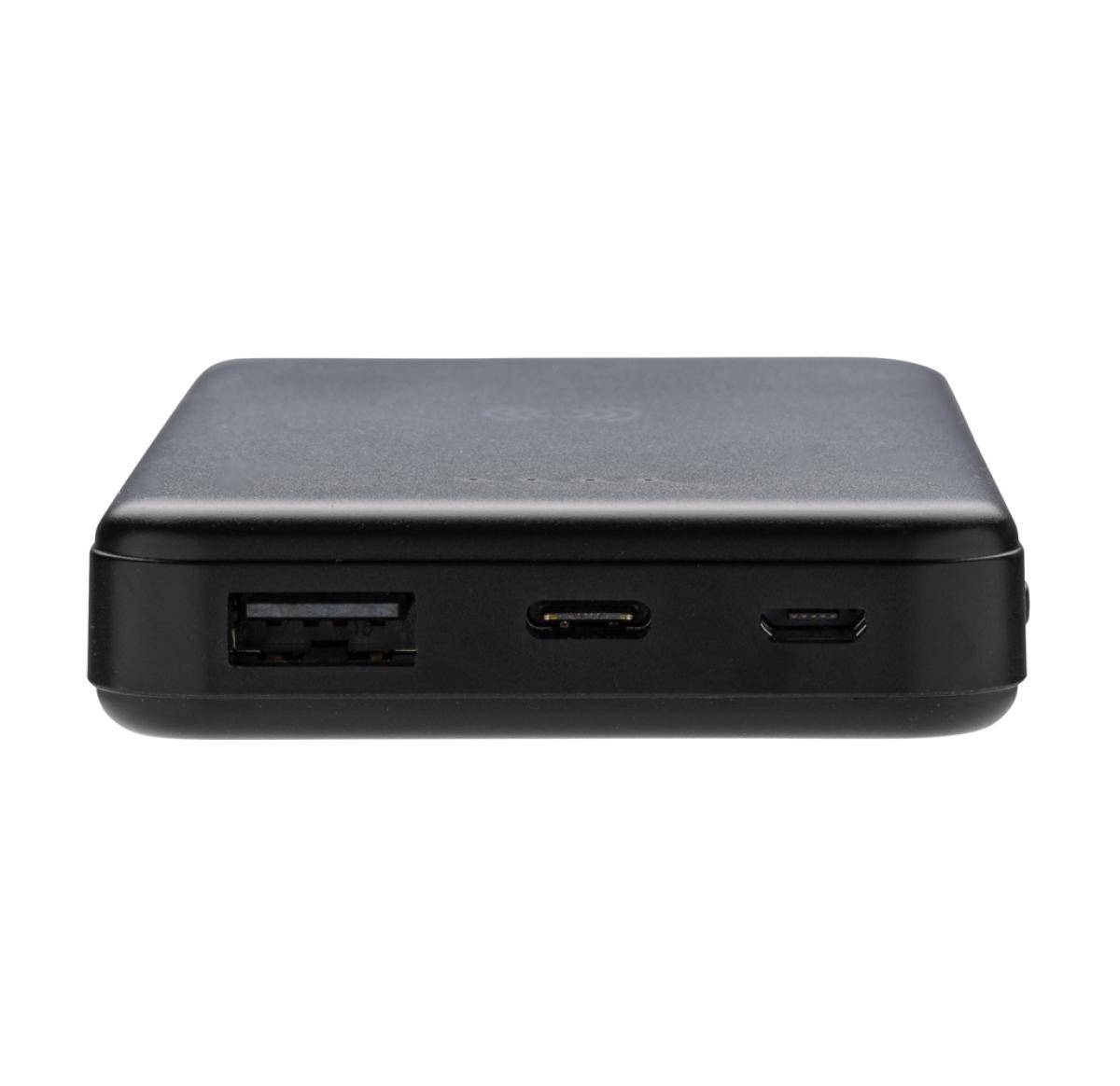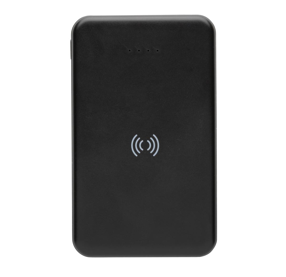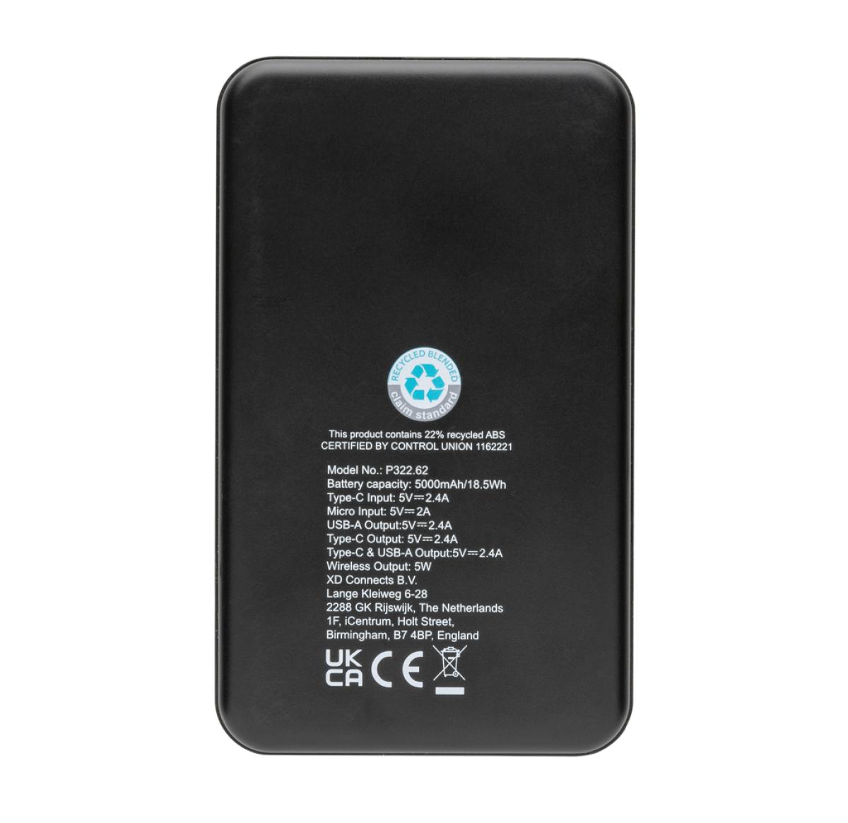 5.000 mAh pocket size powerbank with 5W wireless charger where the case is made out of RCS certified recycled ABS plastic. RCS (Recycled Claim Standard) is a standard to verify the recycled content of a product throughout the whole supply chain. Total recycled content: 26 % based on total item weight. When fully charged the powerbank provides you with enough energy to re-charge your mobile phone up to two times. The powerbank contains a long lasting grade A 5.000 mAh high-density lithium polymer battery. The power indicators will indicate the remaining energy level so you always know when to re-charge. Micro USB Input 5V/2A; Type-C Input 5V/2.4A; USB output 5V/2.4A, Type C output:5V/2A Item and accessories PVC free. Including RCS certified recycled TPE charging cable. Packed in FSC® mix packaging.