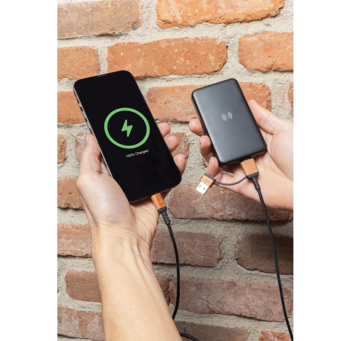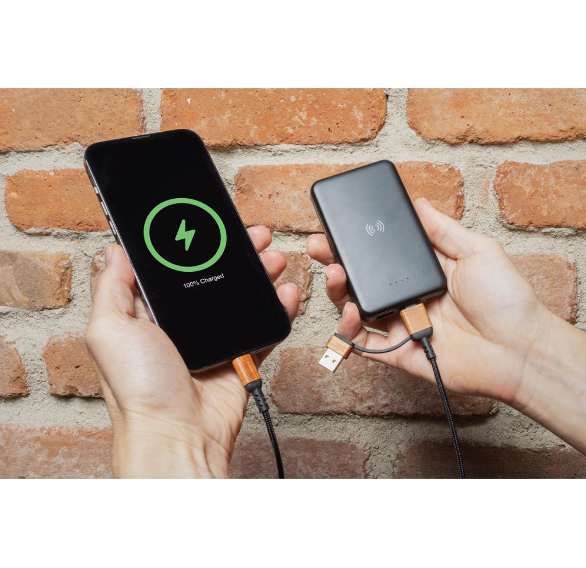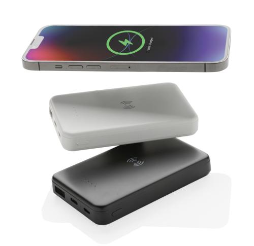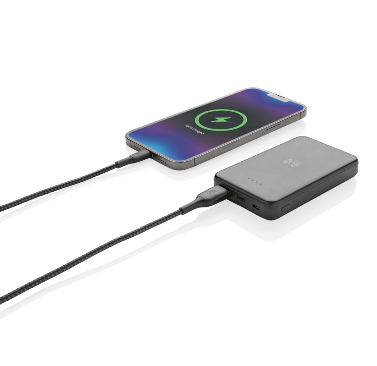 5.000 mAh pocket size powerbank with 5W wireless charger where the case is made out of RCS certified recycled ABS plastic. RCS (Recycled Claim Standard) is a standard to verify the recycled content of a product throughout the whole supply chain. Total recycled content: 26 % based on total item weight. When fully charged the powerbank provides you with enough energy to re-charge your mobile phone up to two times. The powerbank contains a long lasting grade A 5.000 mAh high-density lithium polymer battery. The power indicators will indicate the remaining energy level so you always know when to re-charge. Micro USB Input 5V/2A; Type-C Input 5V/2.4A; USB output 5V/2.4A, Type C output:5V/2A Item and accessories PVC free. Including RCS certified recycled TPE charging cable. Packed in FSC® mix packaging.