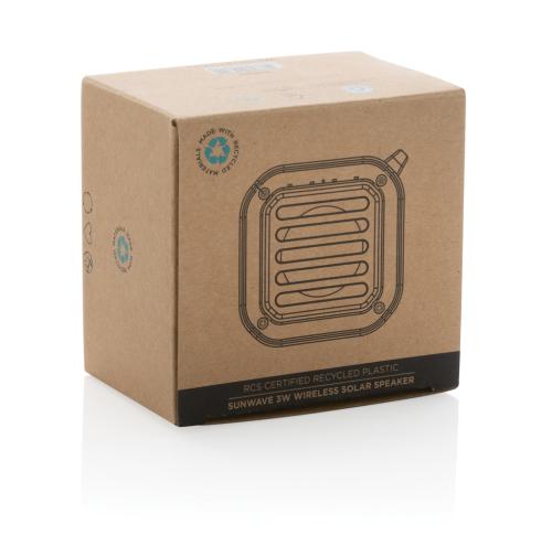 Powerful 3W wireless speaker with integrated solar panel on the back made with RCS certified recycled ABS. Total recycled content: 38% based on total item weight. RCS certification ensures a completely certified supply chain of the recycled materials. The speaker uses high quality monocrystalline solar panels with 19% conversion rate. Charge rate depends on conditions. Charging speed solar: 5V/80mA. The speaker is equipped with a 400 mAh battery to ensure up to 5 hours of playing time and BT5.3 for smooth connection and clear sound. Connection range up to 10 metres. With mic and pick up function to answer calls. With integrated 30 lumen LED light. Packed in FSC mix FSC® box. Including RCS certified recycled TPE charging cable. Item and accessories 100% PVC free. IPX 5 waterproof.