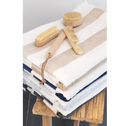 This ultimate luxurious bath towel is the only one you want to take with you to the beach. Its soft and absorbent texture provides ultimate comfort while minimizing your environmental impact. Made with 50% recycled cotton. With AWARE™ tracer that validates the genuine use of recycled cotton. 2% of proceeds of each Impact product sold will be donated to Water.org. Machine washable. Made in Portugal. Size 180x100cm.