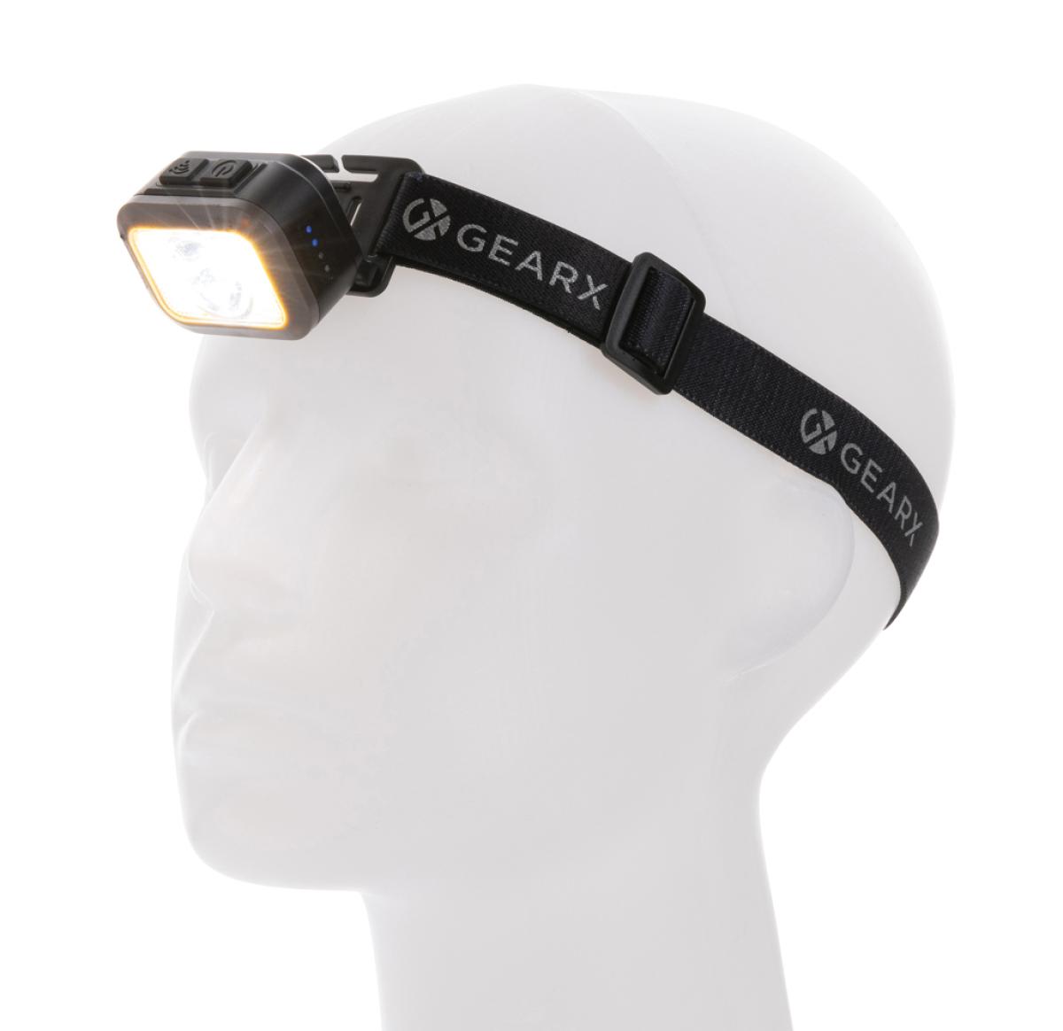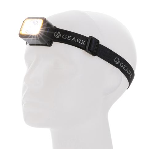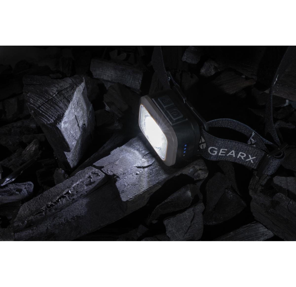 Heavy duty headtorch with integrated high power COB and LED light. The head torch can produce up to 250 lumen and has a beam distance of 70 metres. The casing of the head torch is is made out of RCS certified recycled ABS plastic. RCS (Recycled Claim Standard) is a standard to verify the recycled content of a product throughout the whole supply chain. Total recycled content: 23 % based on total item weight. The head torch is IPX4 waterproof and dust resistant. With adjustable headband to fit all sizes. The head torch has a 800 mAh rechargeable lithium battery that allows 3 hours of non-stop usage on one charge. With 6 light modes that include 100%-50% and SOS mode. Re-charging is easy via type C.