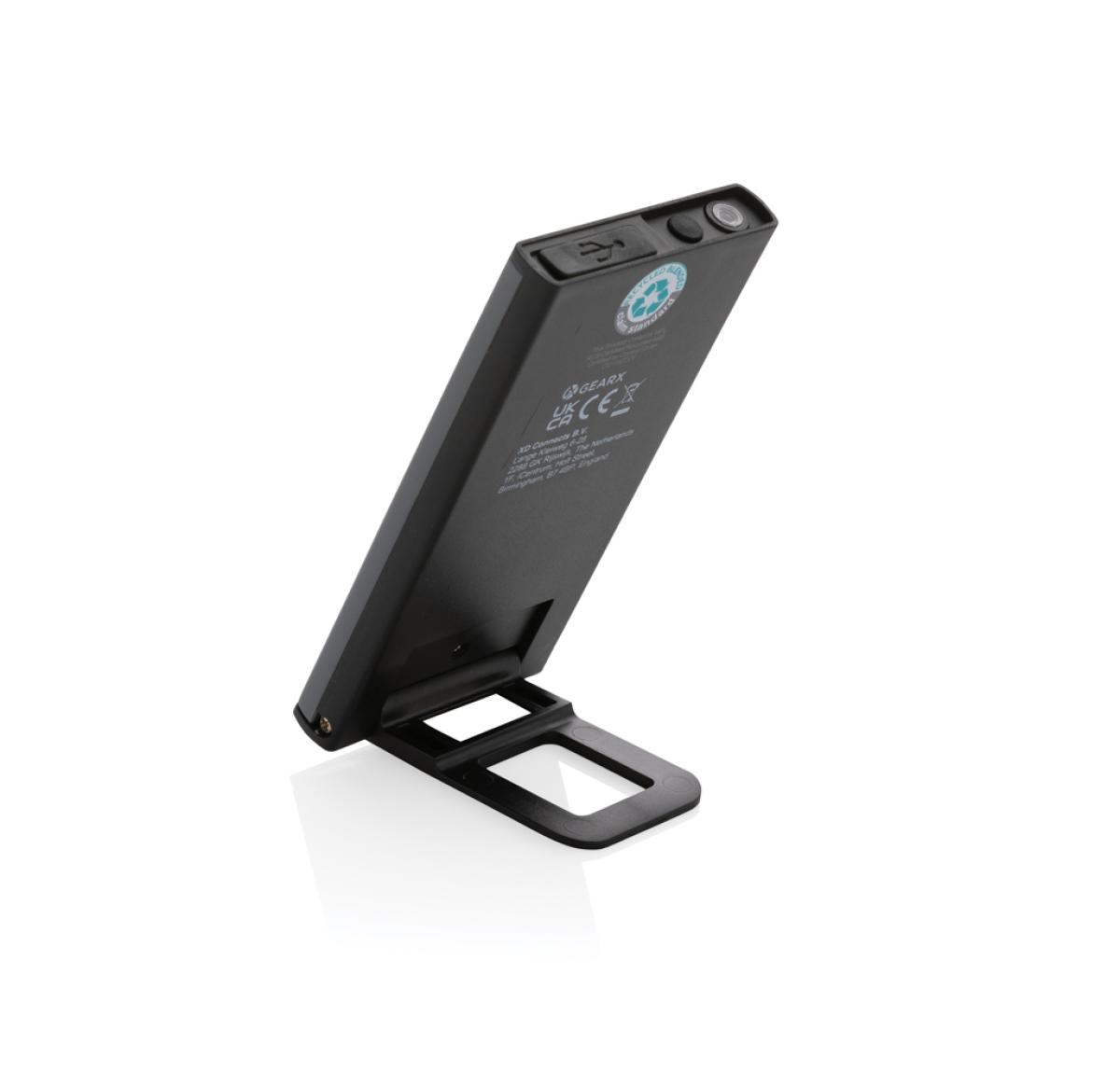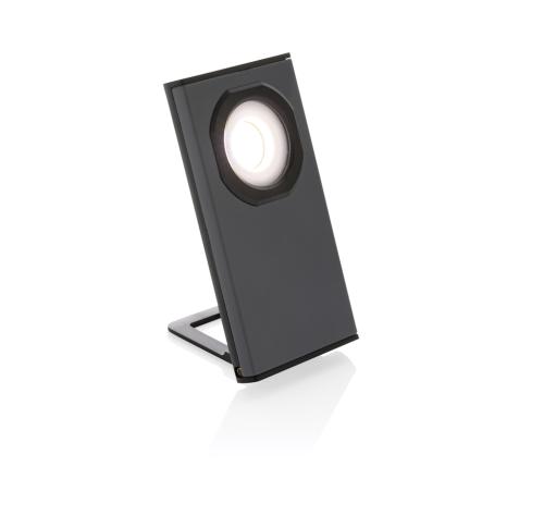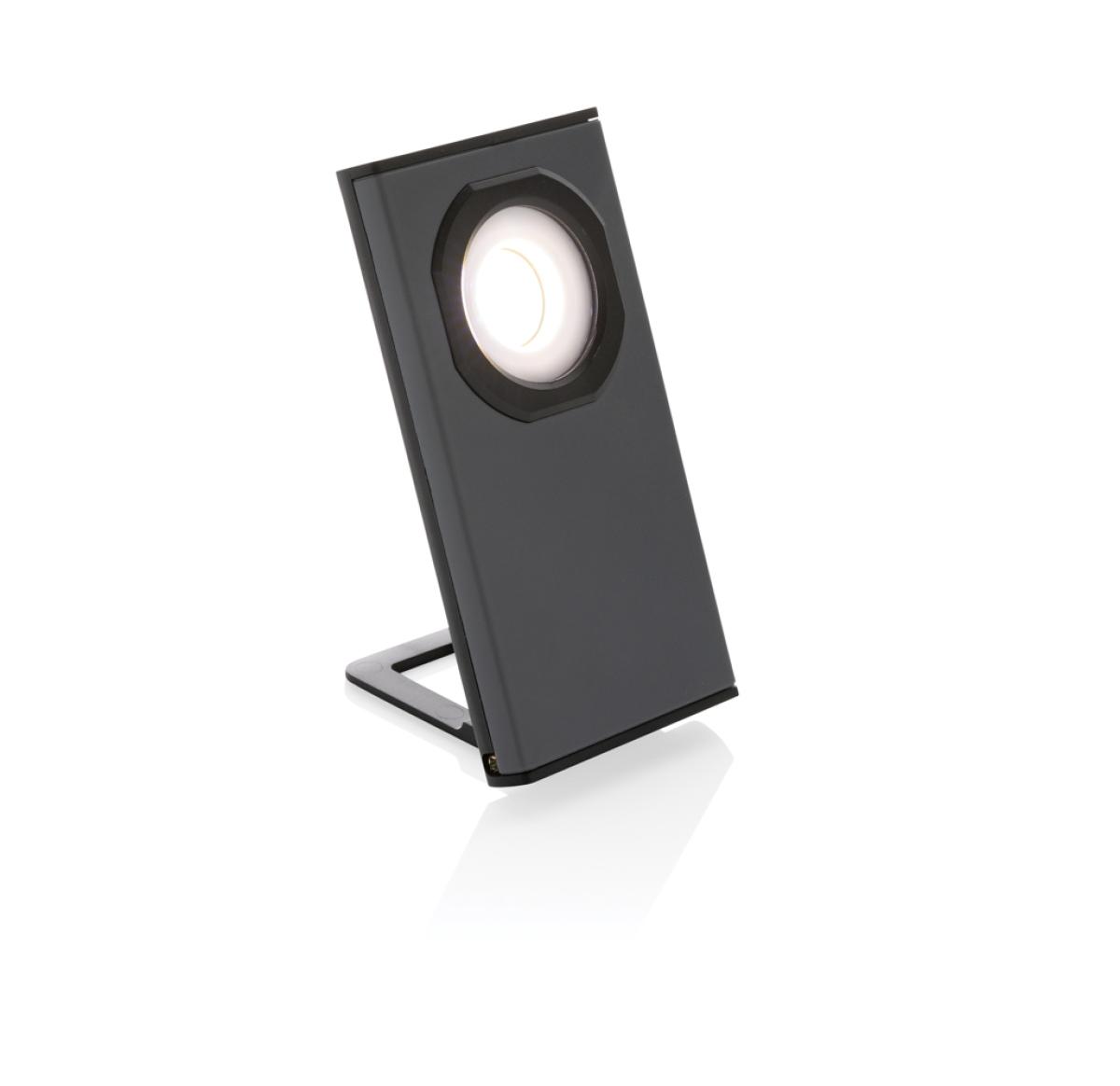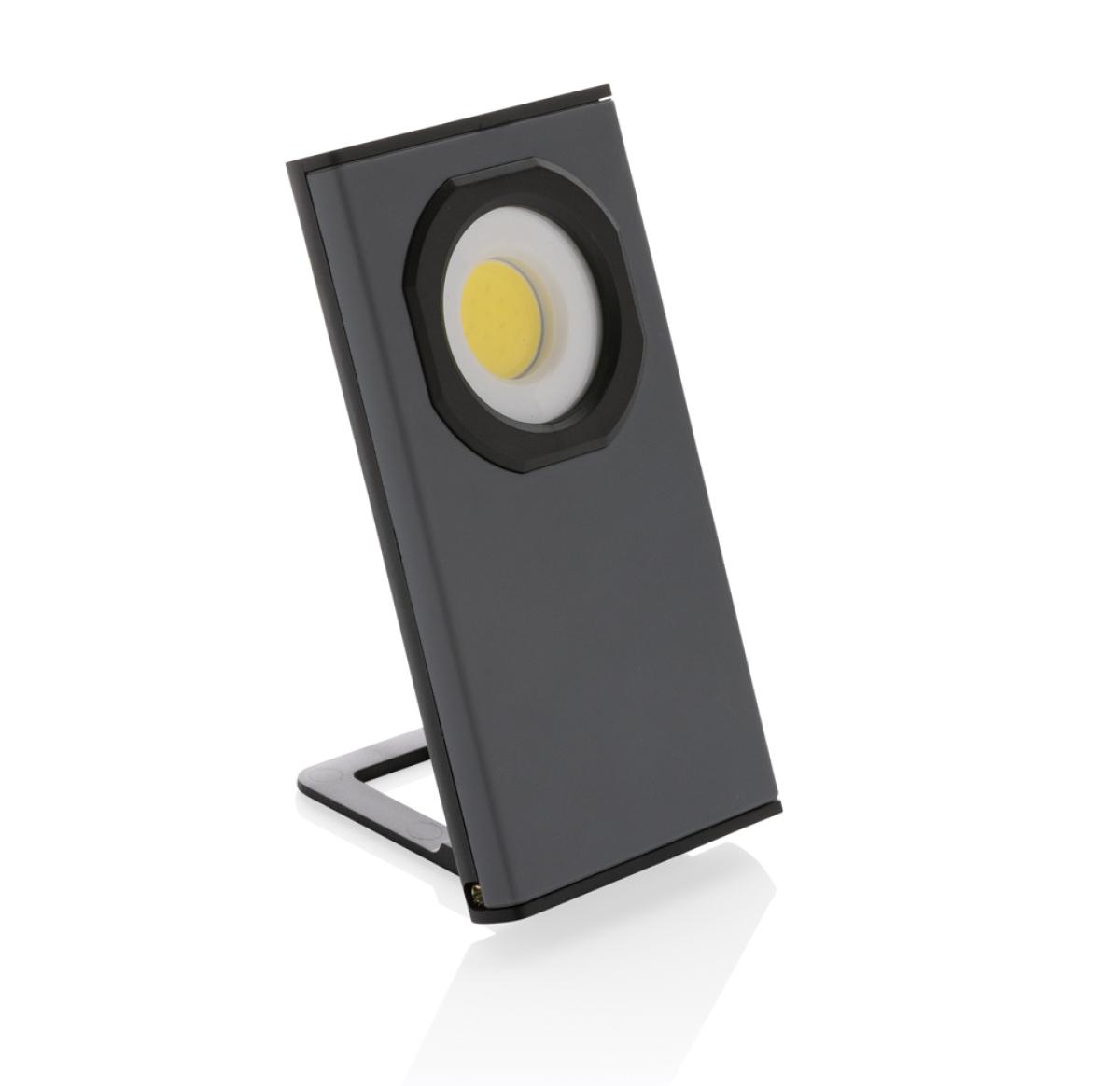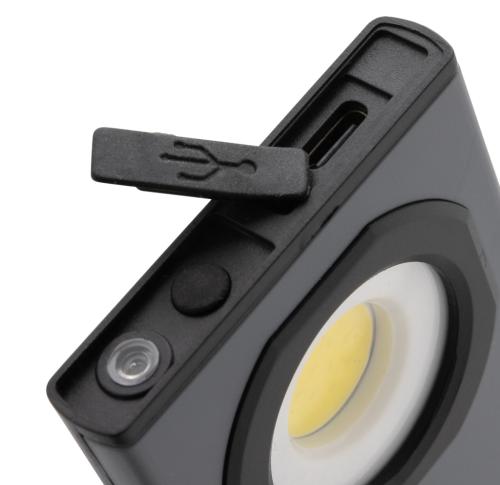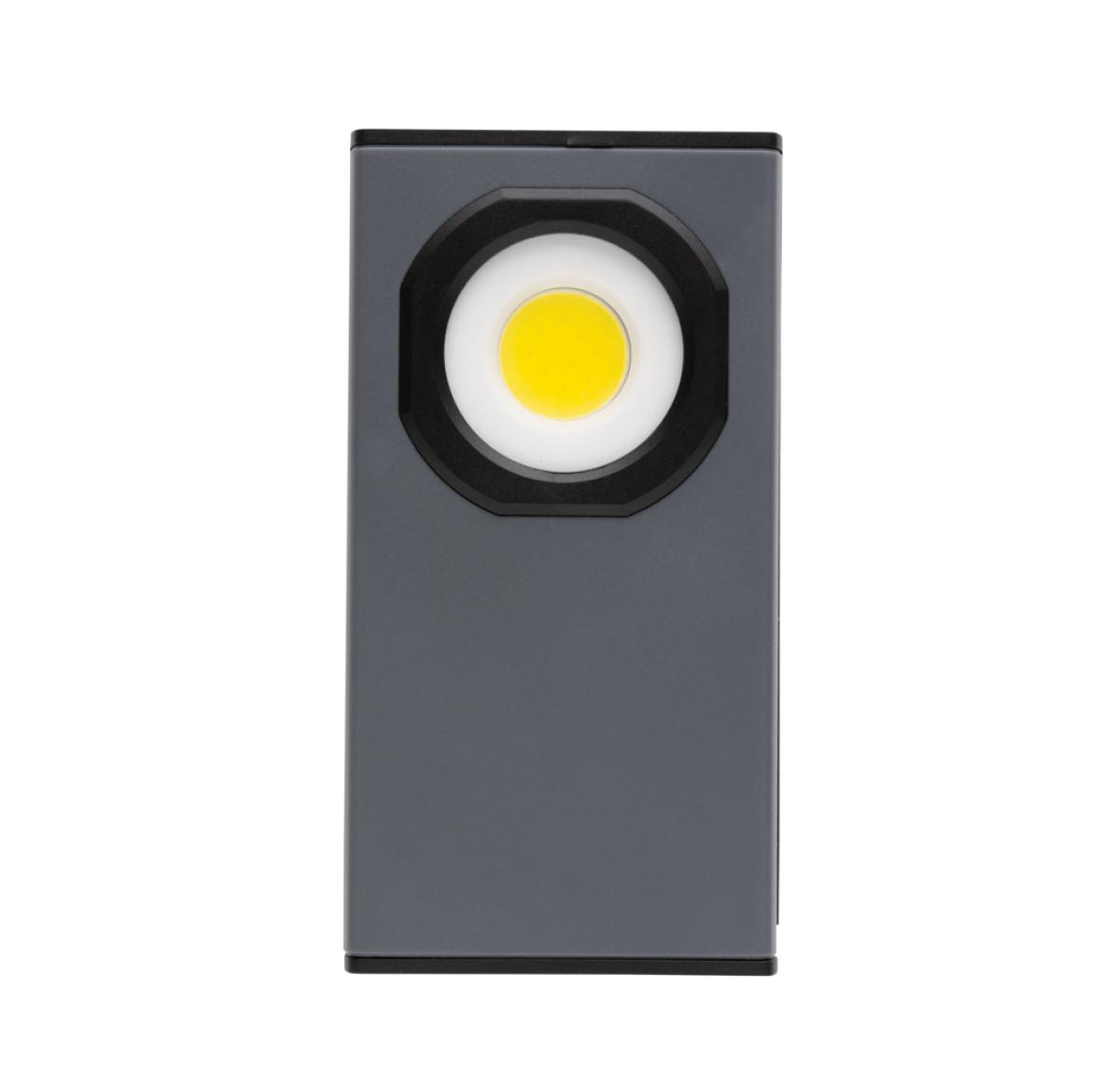 Pocket size work light with super bright COB made with RCS certified recycled ABS plastic. Total recycled content: 36% based total item weight. RCS certification ensures a completely certified supply chain of the recycled materials. The work light uses a re-chargeable A-grade 900 mah lithium battery so no need to replace the batteries. Simply re-charge via your USB socket. The work light comes with 260 lumen COB. With 2 modes:COB and COB 50%. With magnet on the back. With stand function. With type C port for re-charging. Operating time on one charge: 3 hours.