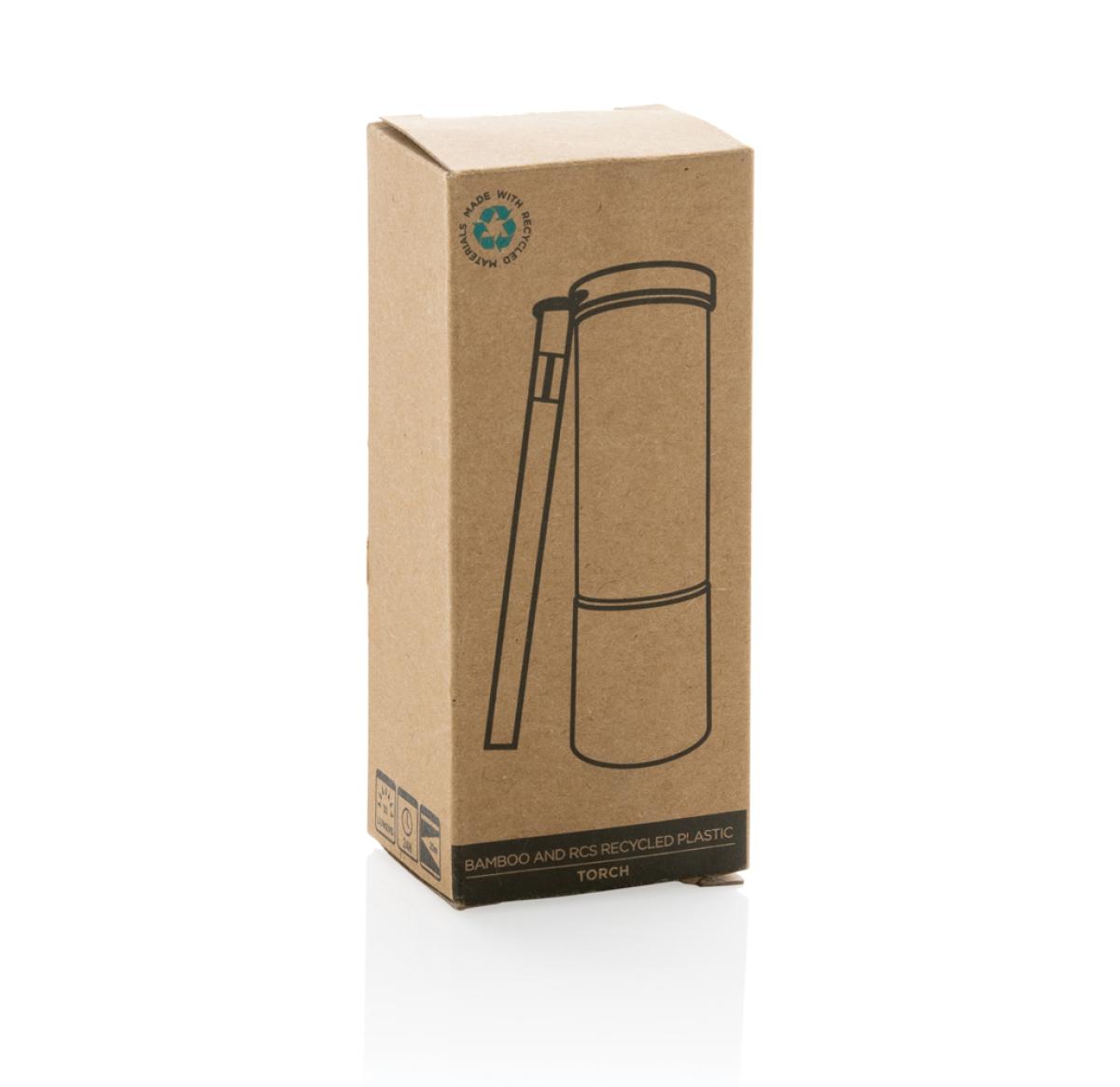 Pocket size torch made with FSC® 100% bamboo and RCS (Recycled Claim Standard) certified recycled ABS. Total recycled content: 36% based on total item weight. RCS certification ensures a completely certified supply chain of the recycled materials.. The beam distance is 20 metres and provides 30 lumen.Packed in FSC® mix kraft packaging. Item and accessories 100% PVC free. Including batteries.
