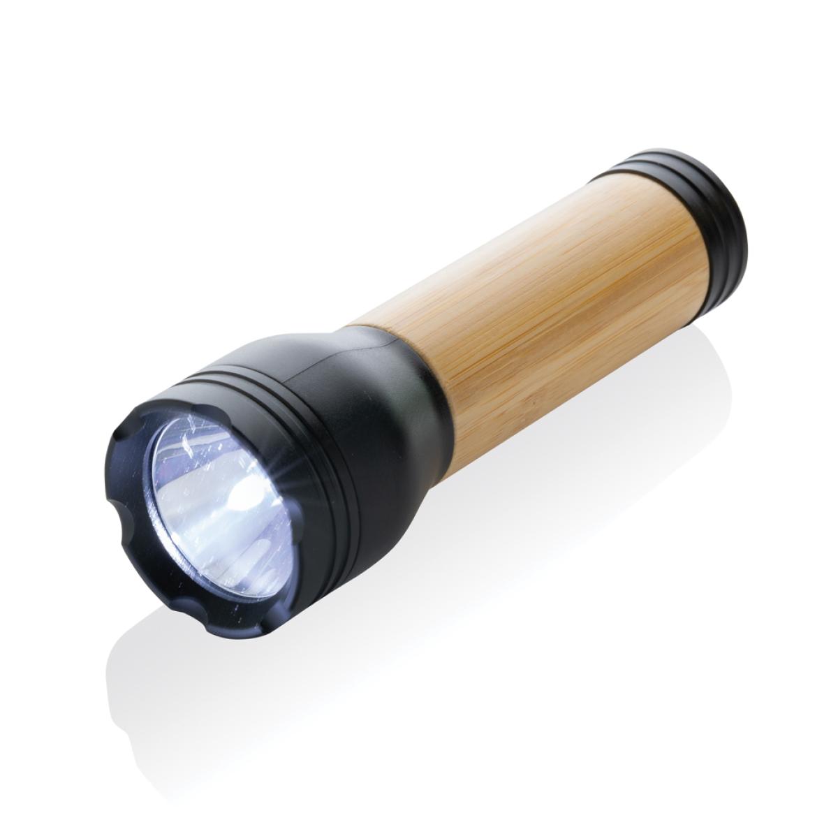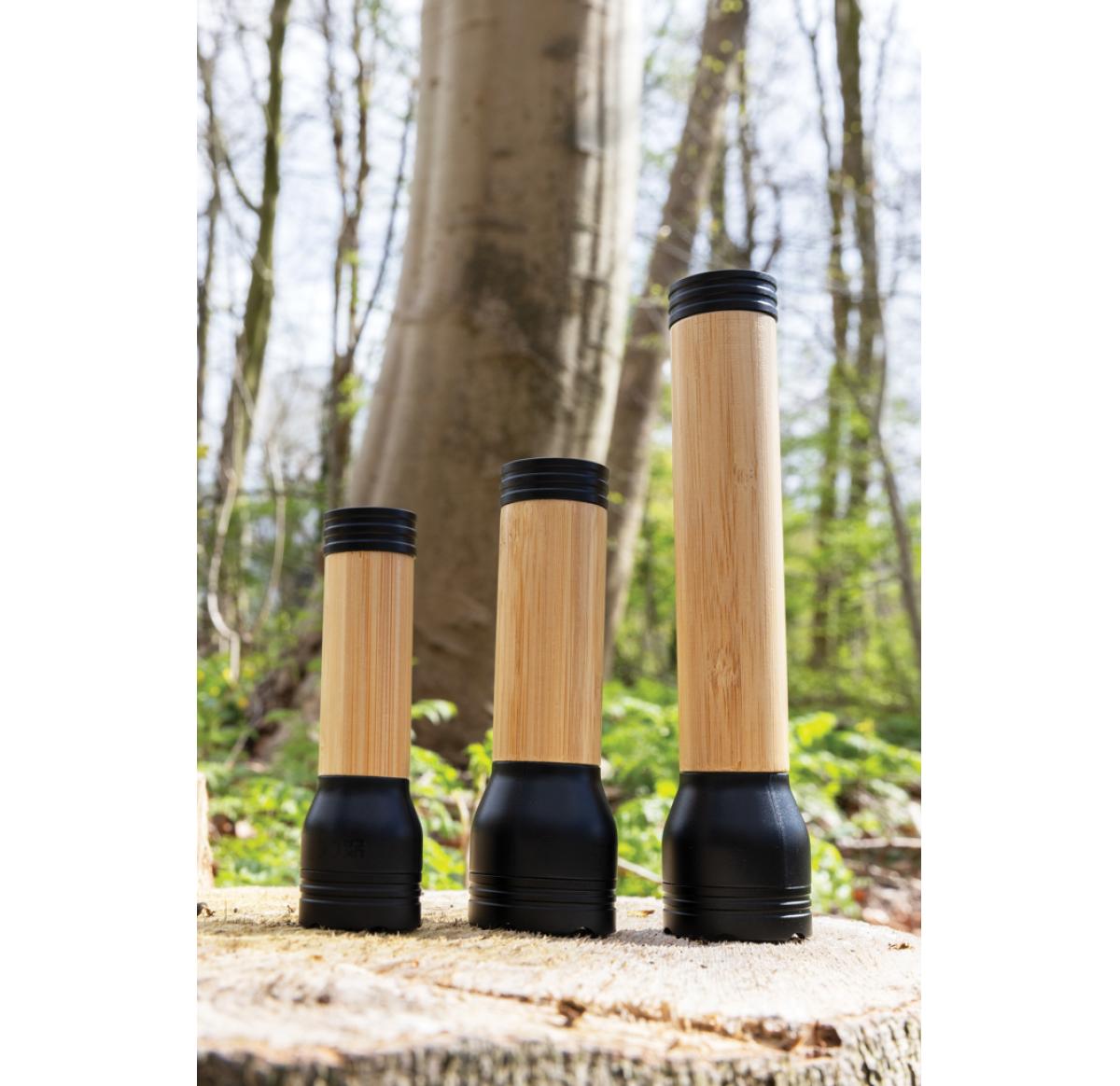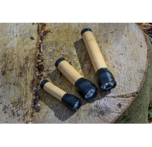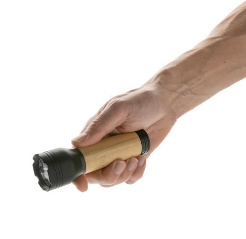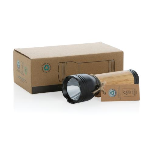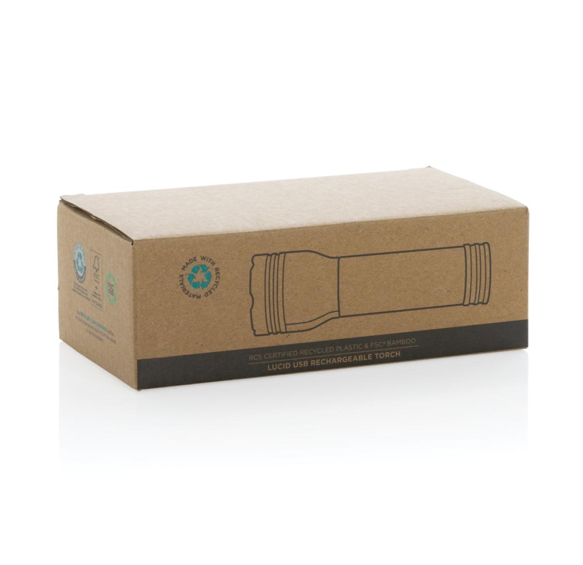 USB rechargeable 3W torch made with FSC® 100% bamboo and RCS (Recycled Claim Standard) certified recycled ABS. Total recycled content: 20% based on total item weight. RCS certification ensures a completely certified supply chain of the recycled materials. The torch comes with 1200 mah grade-A lithium battery. The torch can be operated up to 4.5 hours on one single charge and recharged via type c in 2.5 hours. The beam distance is 100 metres and provides 120 lumen. With 3 modes (bright, medium and flash). Including RCS certified recycled TPE charging cable. Packed in FSC® mix kraft packaging. Item and accessories 100% PVC free.