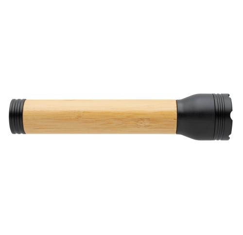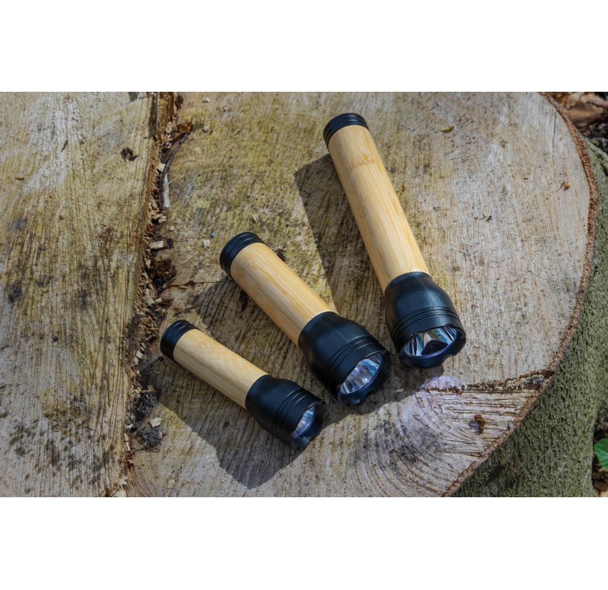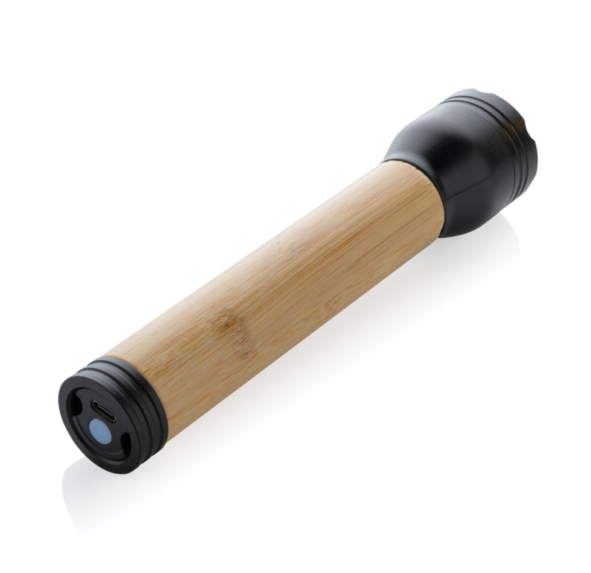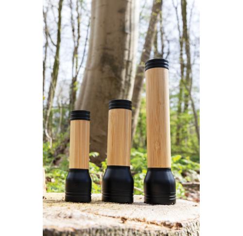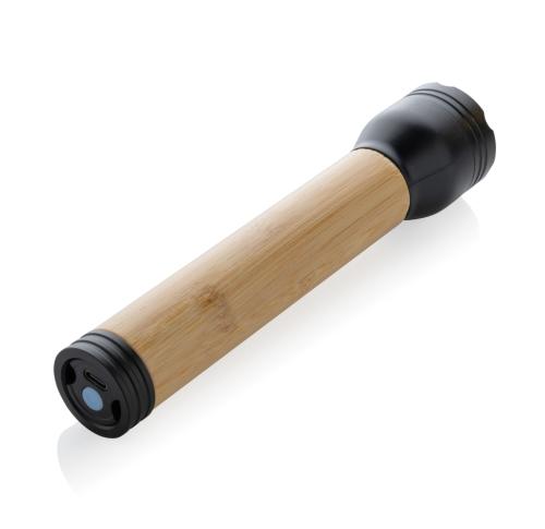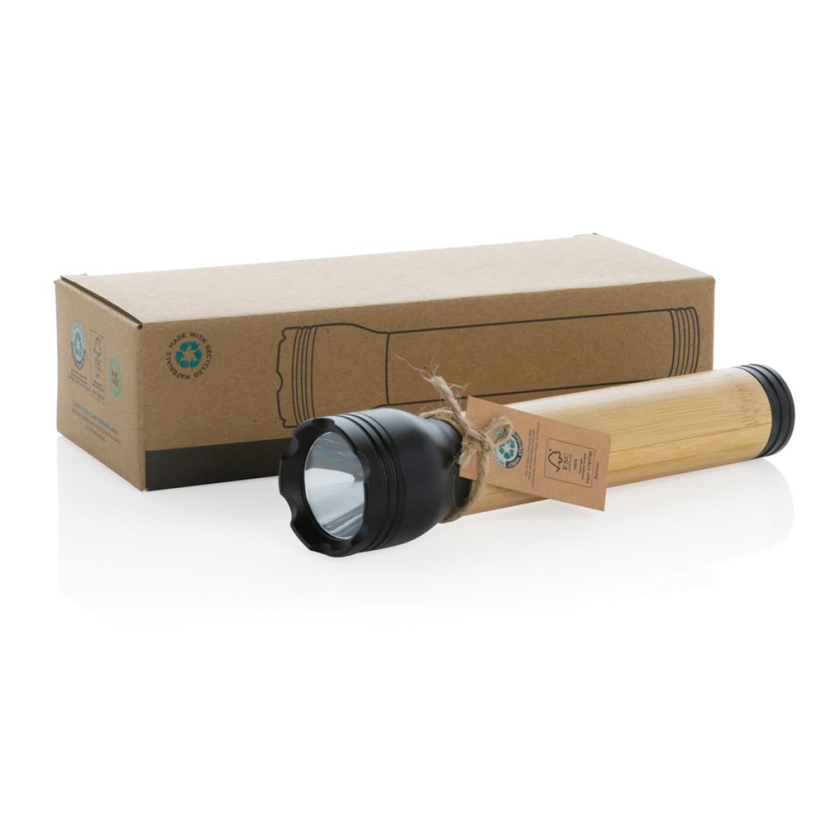 USB rechargeable 5W torch made with FSC® 100% bamboo and RCS (Recycled Claim Standard) certified recycled ABS. Total recycled content: 18% based on total item weight. RCS certification ensures a completely certified supply chain of the recycled materials. The torch comes with 1800 mah grade-A lithium battery. The torch can be operated up to 6 hours on one single charge and recharged via type c in 5 hours. The beam distance is 150 metres and provides 300 lumen. With 3 modes (bright, medium and flash). Including RCS certified recycled TPE charging cable. Packed in FSC® mix kraft packaging. Item and accessories 100% PVC free.