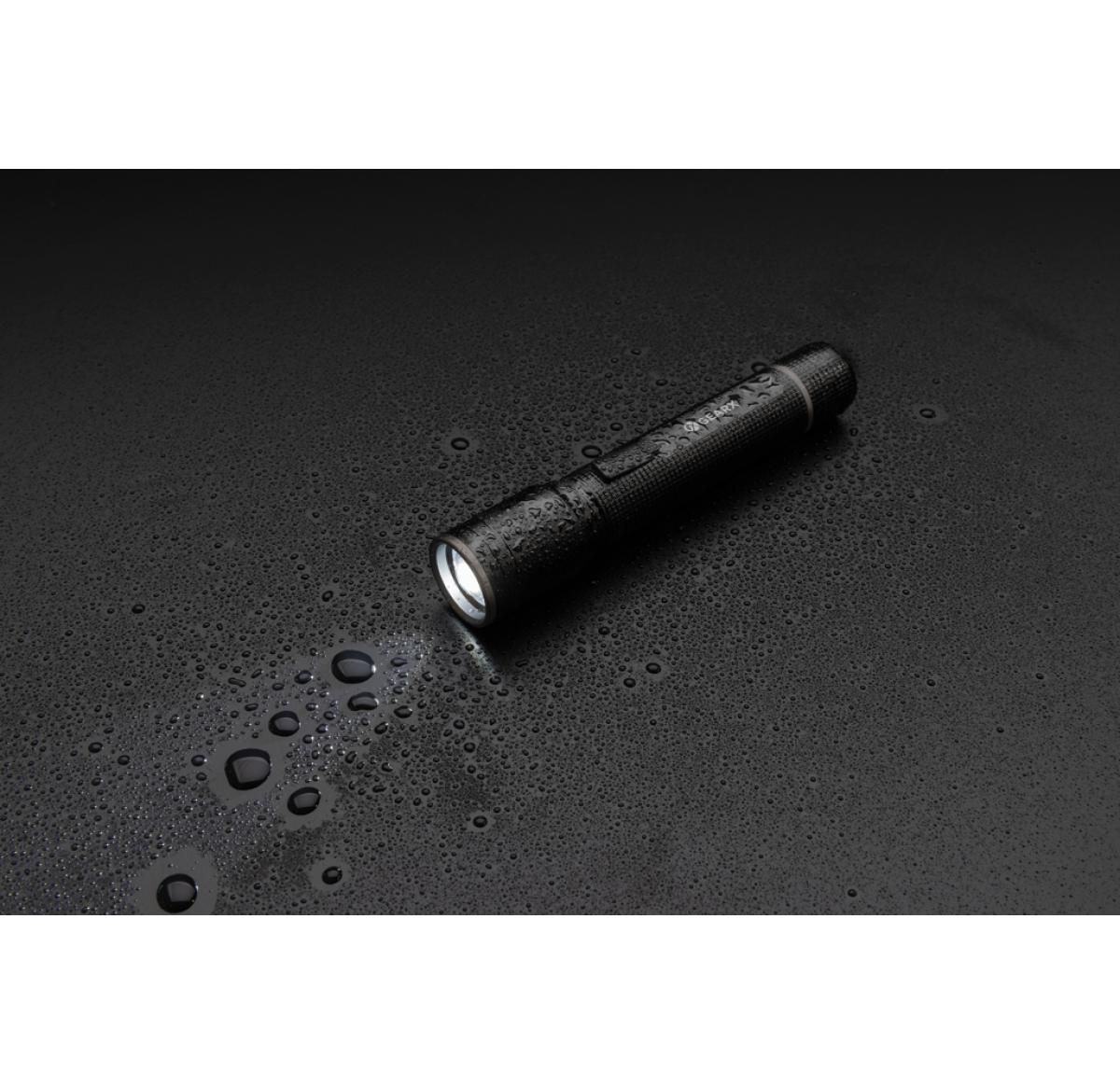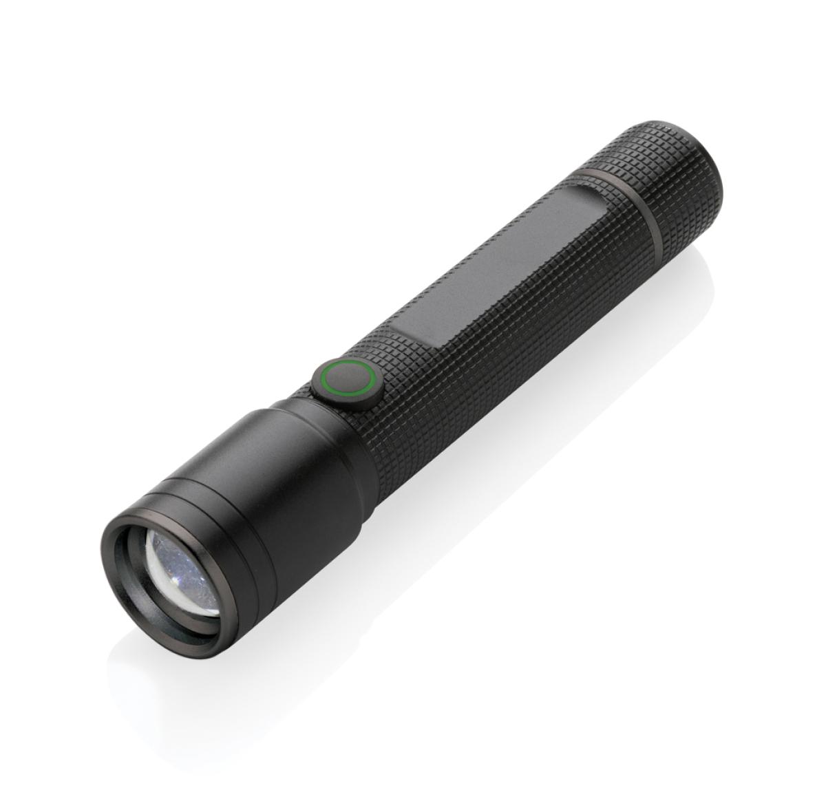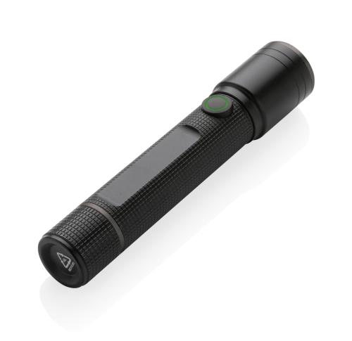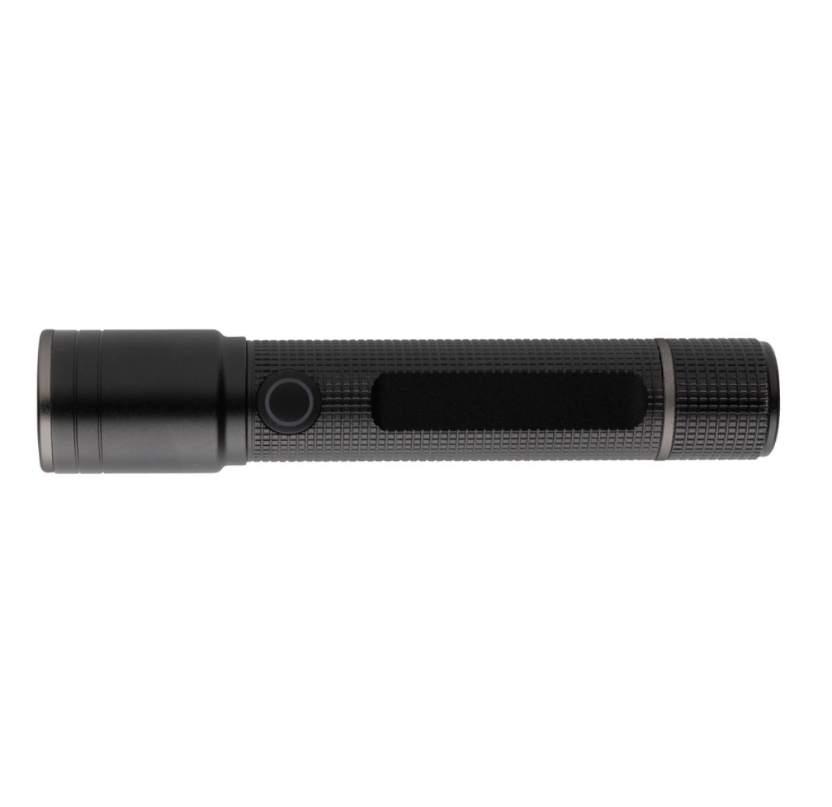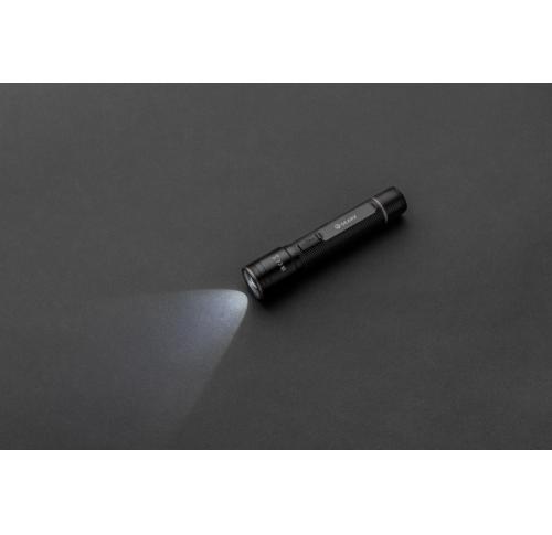 Functionality, performance and design all come together in this re-chargeable 3W torch made with RCS certified recycled aluminum. Total recycled content: 20% based on total item weight. RCS certification ensures a completely certified supply chain of the recycled materials. Because of its IP4 rating, it is weatherproof so can easily be taken outside. The powerful bulb creates up to 100 lumen and a beam that reaches up to 100 metres. The torch uses a re-chargable A-grade battery so no need to replace the batteries. Simply re-charge via your USB socket and the included RCS certified recycled type C cable. The high quality bulb comes with 5 modes including SOS function. The 500 mah battery allows a usage up to 4 hours on a single charge. Aluminum does not lose its characteristics in the recycling process and can be recycled endlessly. Item and accessories 100% PVC free. Packed in FSC mix packaging.