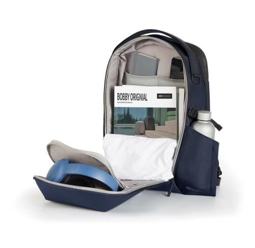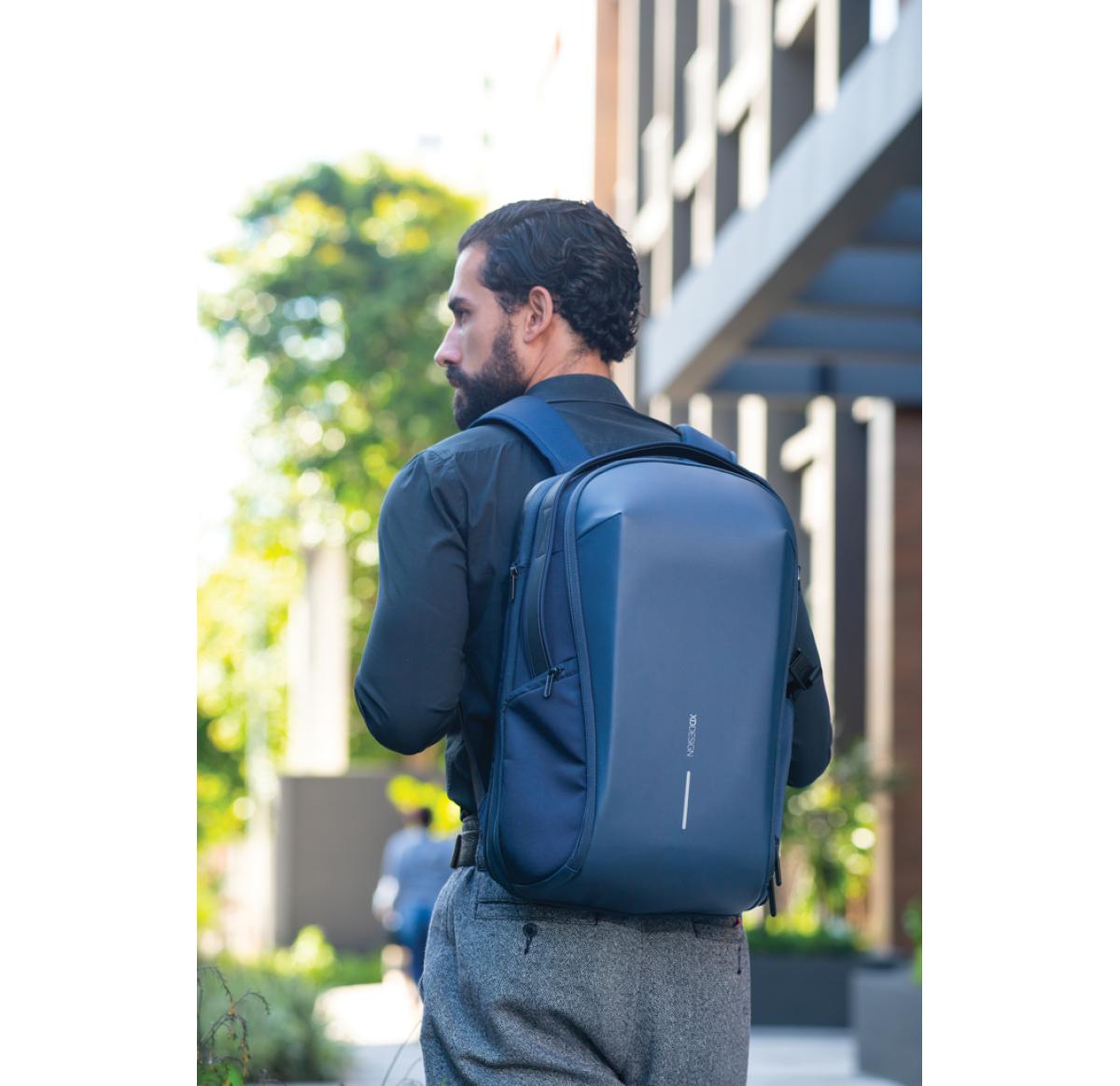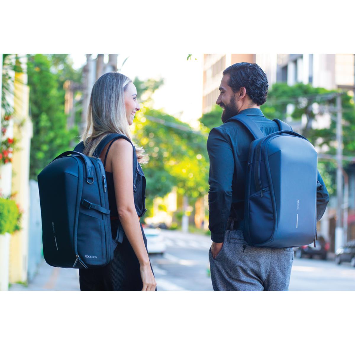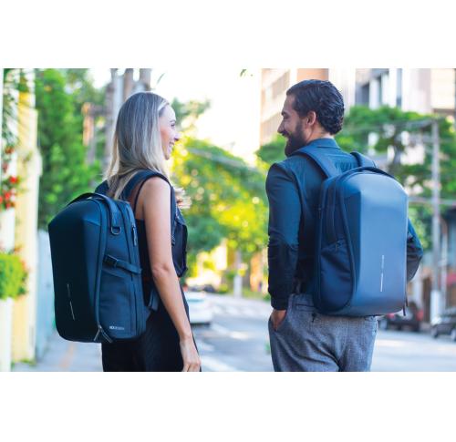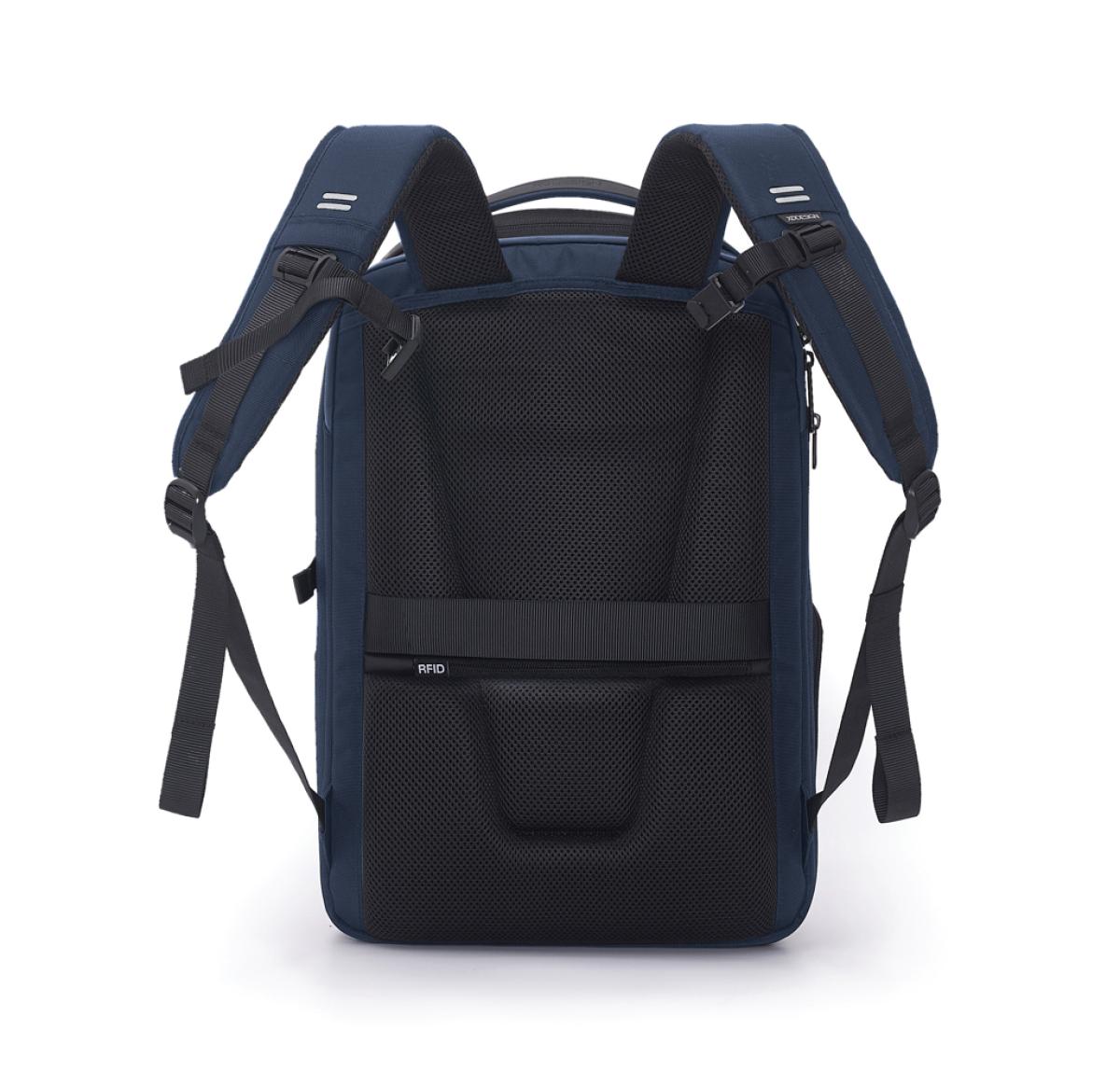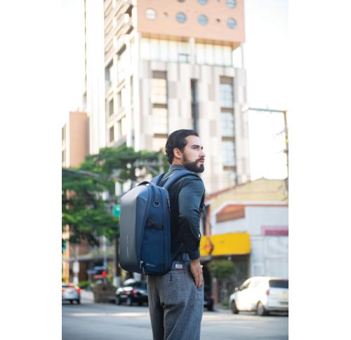 The Bizz Backpack is perfect for daily carry and light travel. The backpack features a 180-degree opening main compartment with an expandable section, internal mesh pockets, an integrated tech pouch, and a detachable key leash. The rear pocket is protected with a waterproof zipper and features a padded sleeve for up to a 16” laptop. External easy access pockets are abundant including a high capacity water bottle pocket with a magnetic closure. The backpack is water-resistant and produced with recycled materials. Made from R-pet fabric with the AWARE™ tracer. With AWARE™, the use of genuine recycled fabric is guaranteed. 27% recycled content. Registered design®