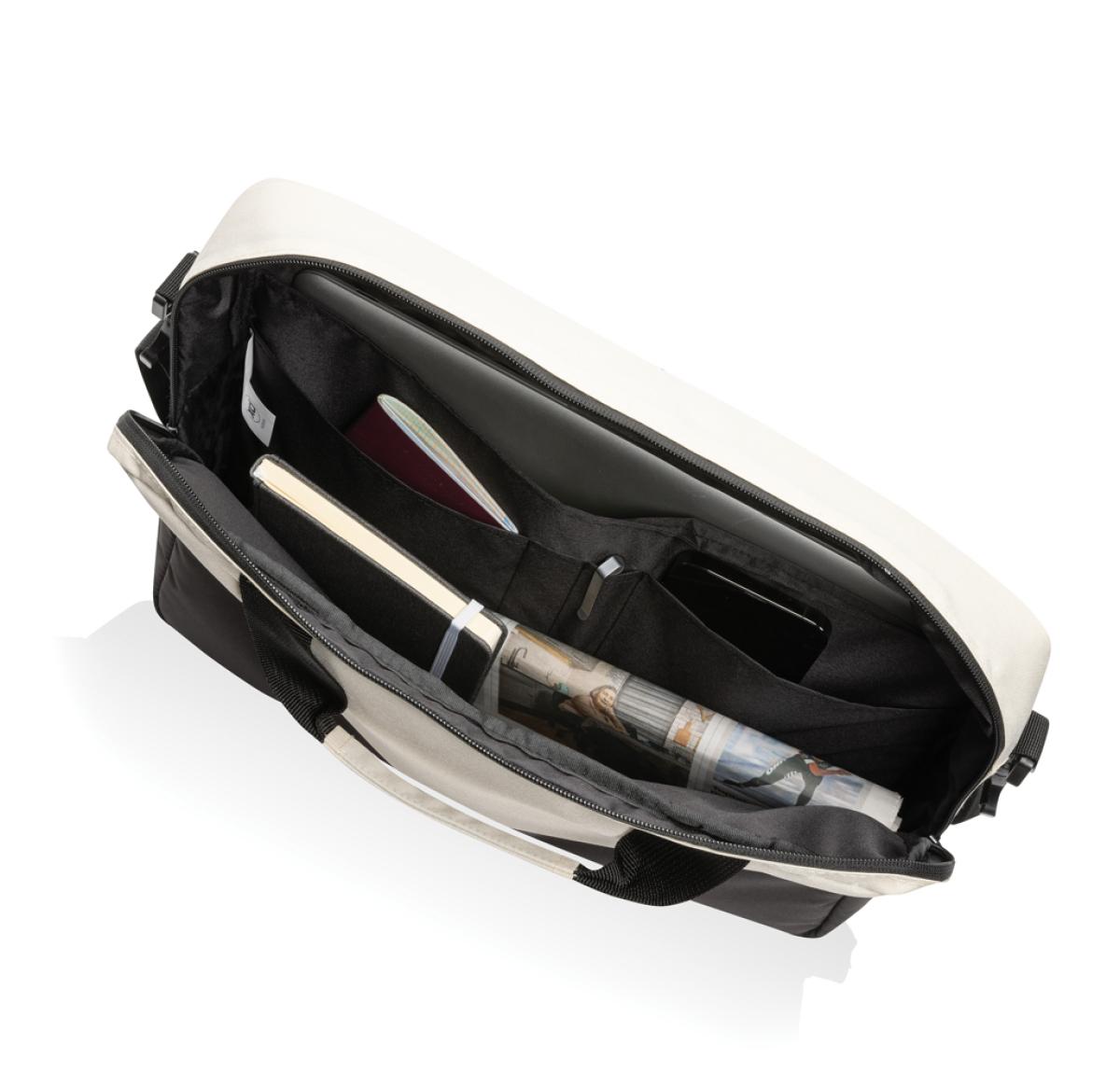 This bag seamlessly marries practicality with style. Its spacious main compartment includes a dedicated 15.6-inch laptop pocket to safeguard your valuable items. Additionally, interior pen loops and well-designed pockets help you stay organized while on the move, and the front pocket adds an extra layer of convenience. Made with 100% recycled polyester embedded with the AWARE™ tracer. 2% of proceeds of each product sold with AWARE™ will be donated to Water.org.