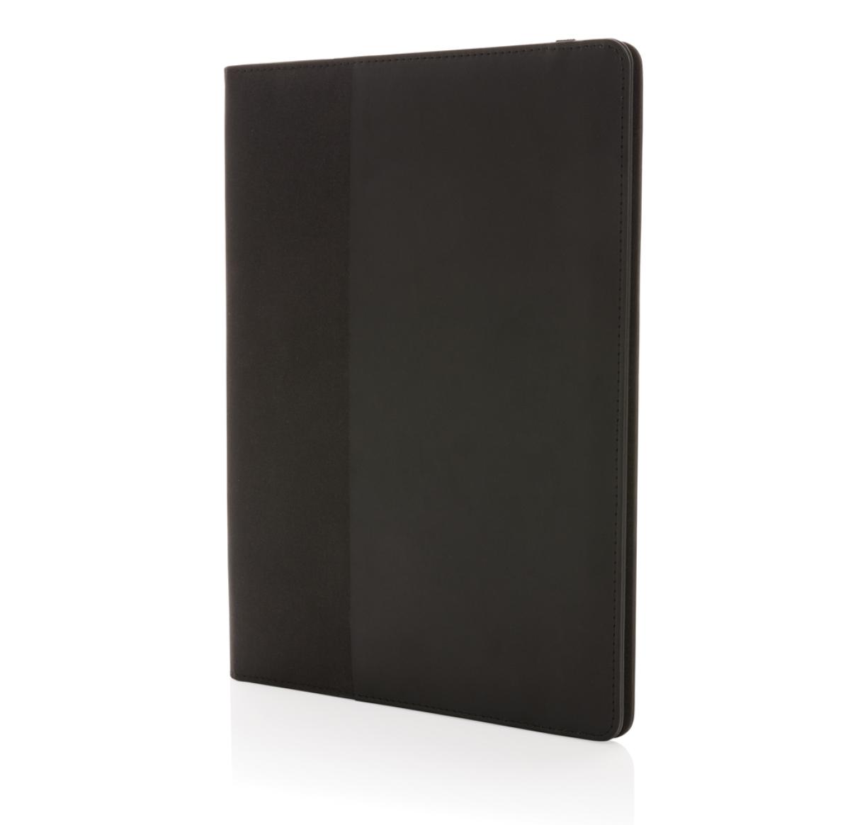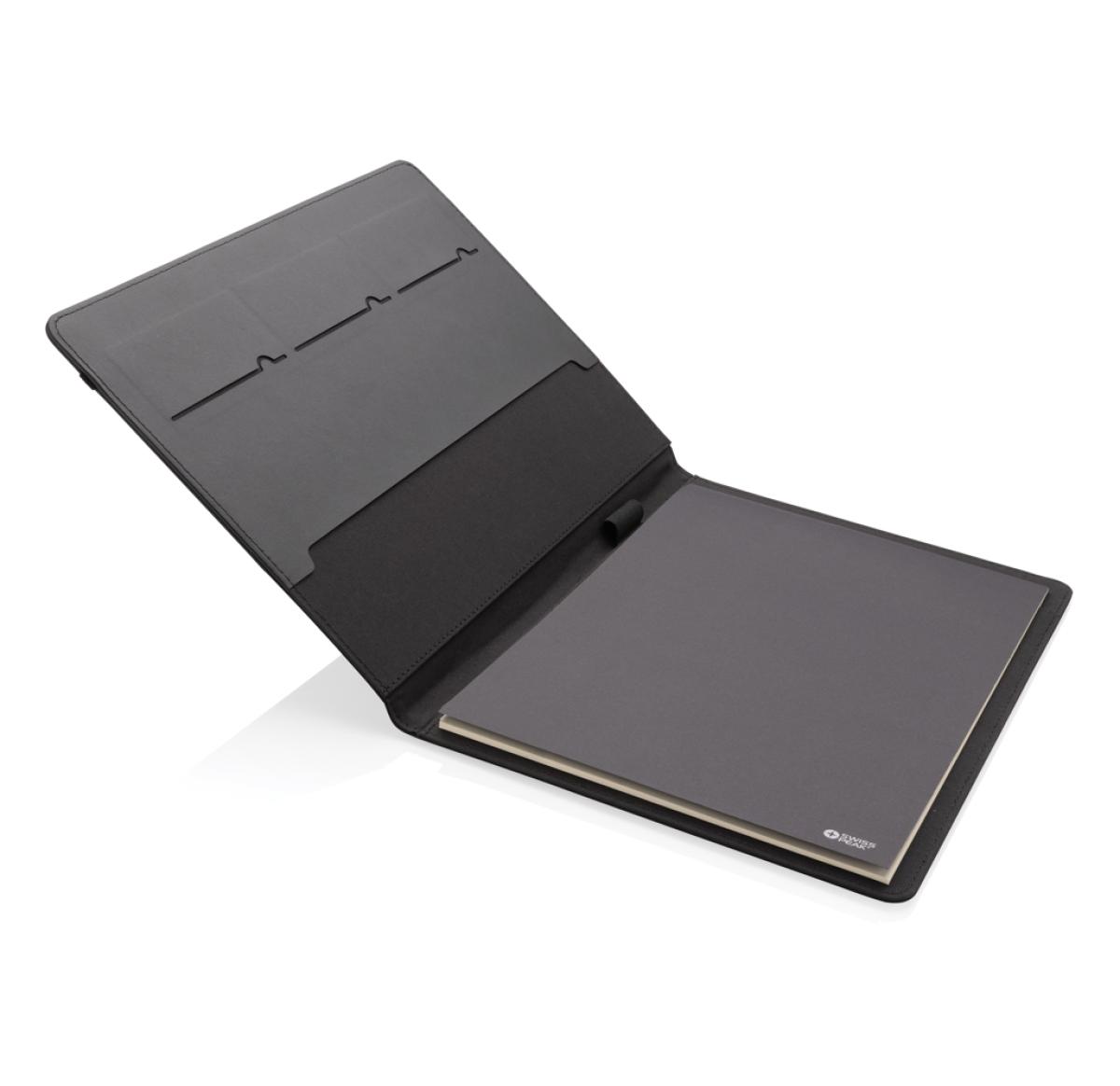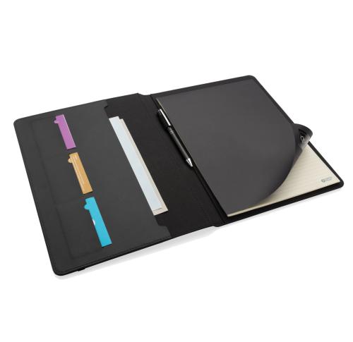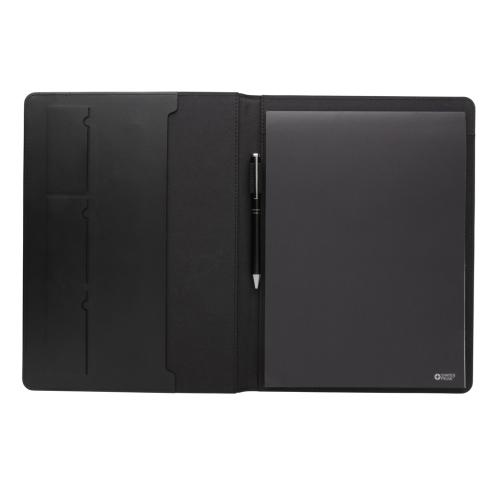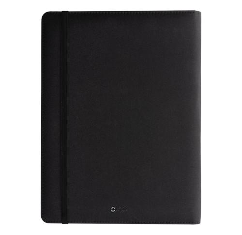 Crafted from 100% AWARE 300D recycled polyester and RCS certified recycled PU, this portfolio blends style and low impact. It features business card slots, pen loop, and a spacious A4 pocket. Stay organized with the refillable A4 lined notepad (20 pages 70 gsm) made from FSC® mix cream paper. Experience sophistication with a conscience. Made with 100% recycled polyester embedded with the AWARE™ tracer. Packed in an FSC® gift box.