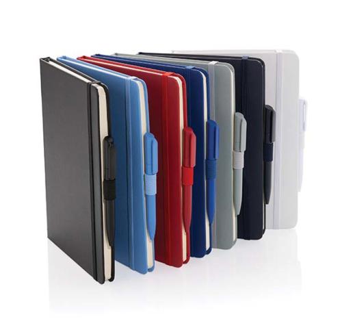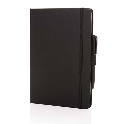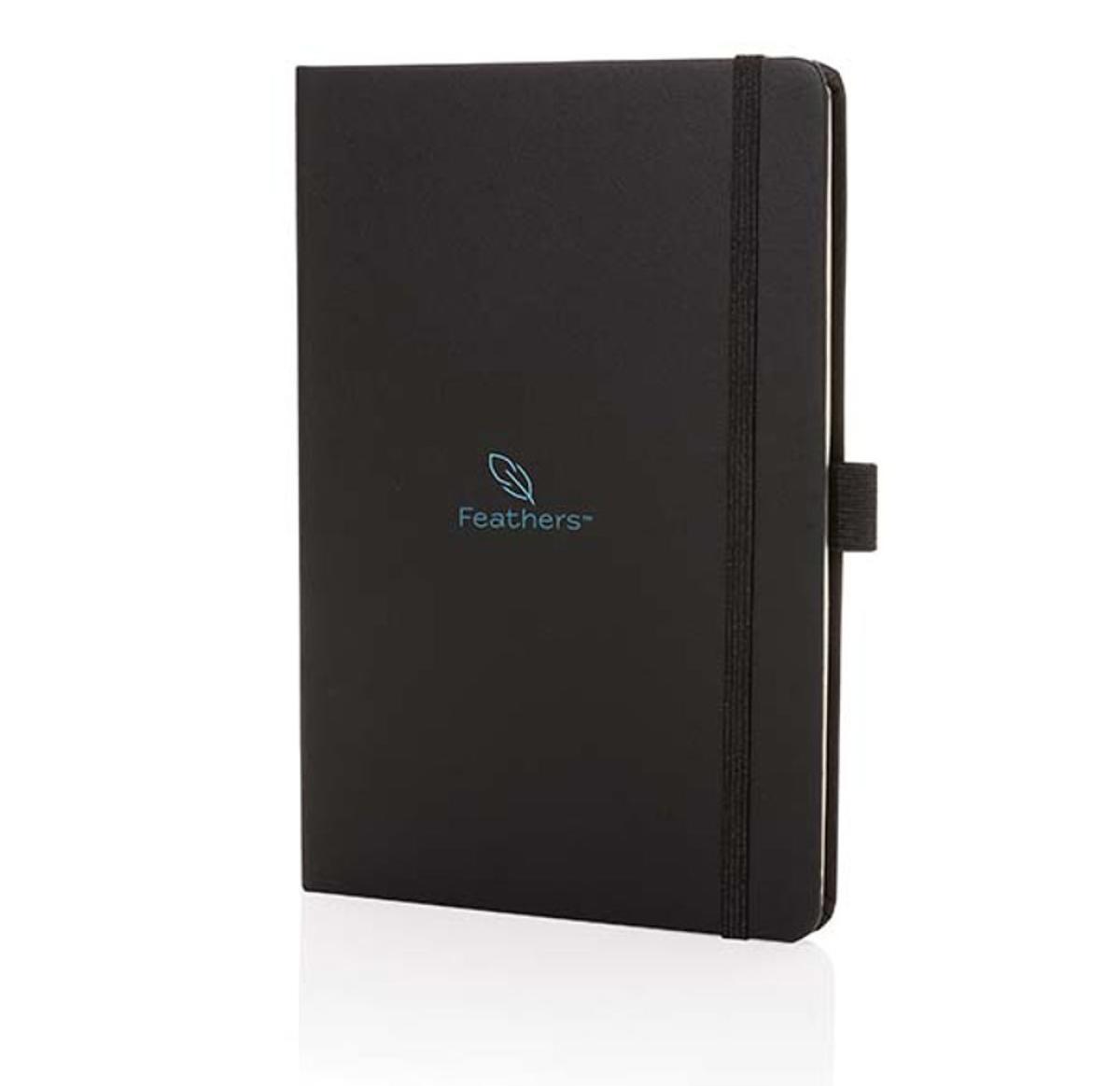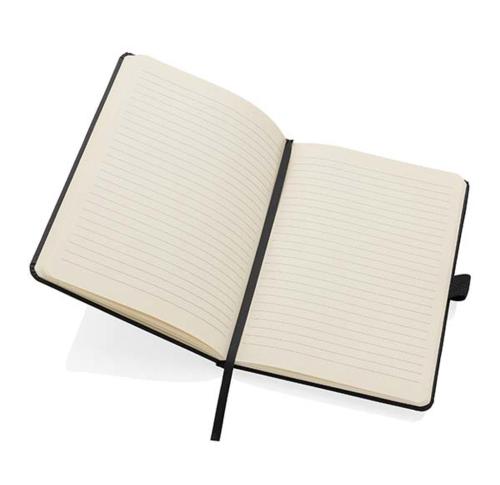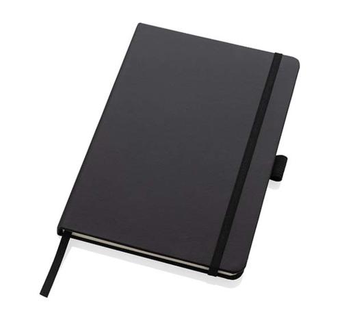 Jot down your thoughts and creative inspirations in this elegant A5 RCS certified recycled bonded leather hardcover notebook. Its stylish design boasts a beautiful finish, making it a sophisticated choice for your writing needs. The notebook is equipped with 80 sheets/160 pages of high-quality 70 gm/s white colored lined RCS certified recycled paper. It also features a vertical elastic band and a convenient pen loop, adding to its practicality and charm. Total recycled content: 67% based on total item weight.