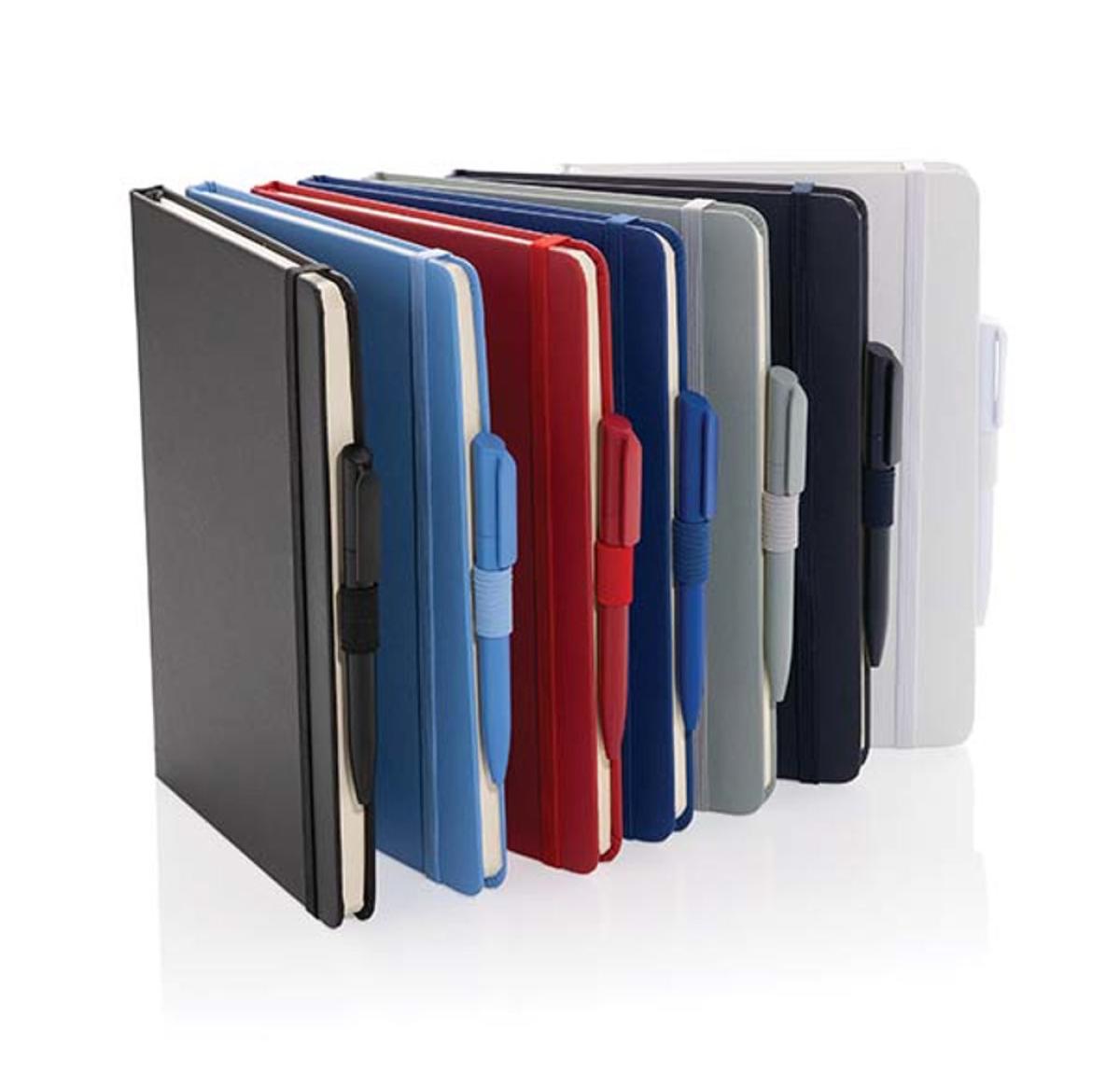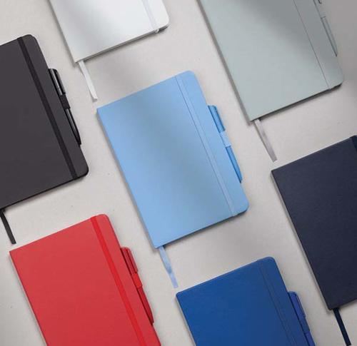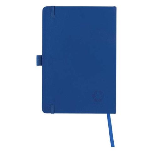 Jot down your thoughts and creative inspirations in this elegant A5 RCS certified recycled bonded leather hardcover notebook. Its stylish design boasts a beautiful finish, making it a sophisticated choice for your writing needs. The notebook is equipped with 80 sheets/160 pages of high-quality 70 gm/s white colored lined RCS certified recycled paper. It also features a vertical elastic band and a convenient pen loop, adding to its practicality and charm. Total recycled content: 67% based on total item weight.