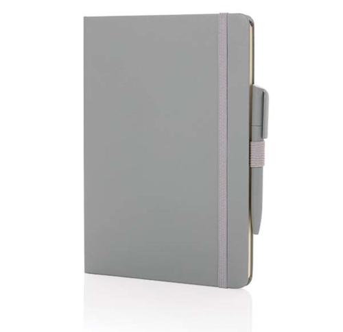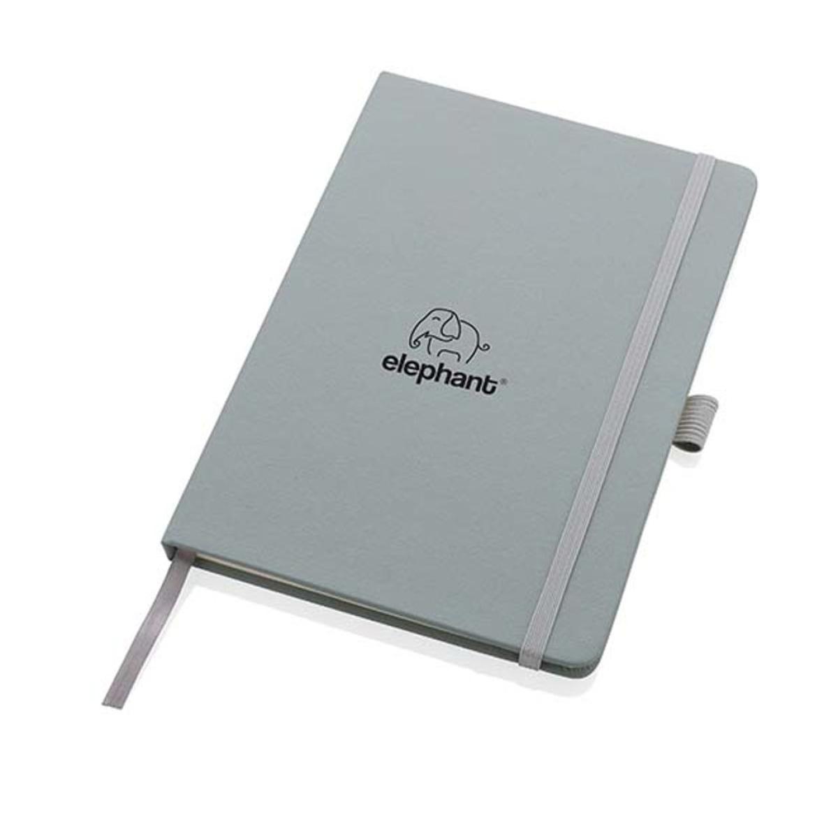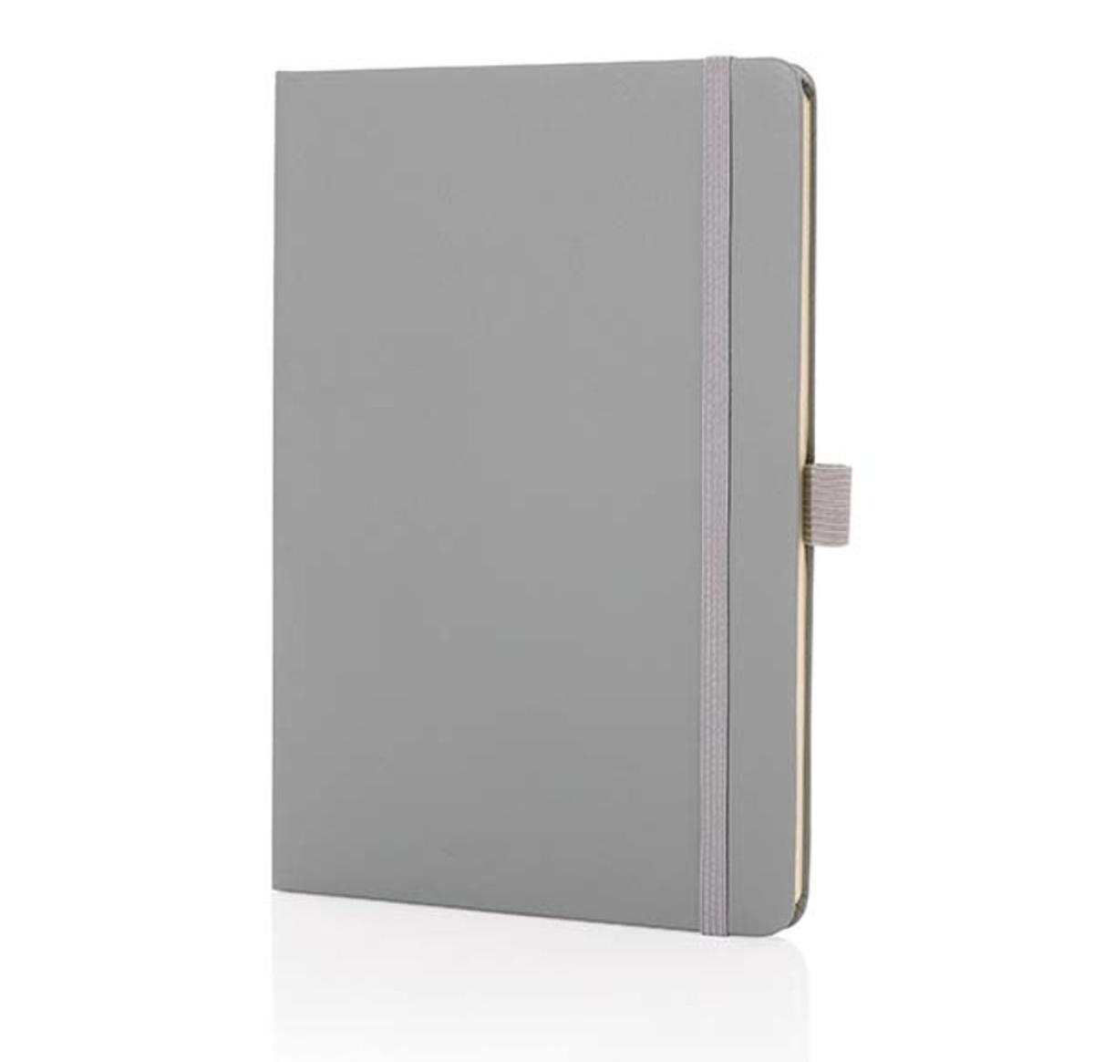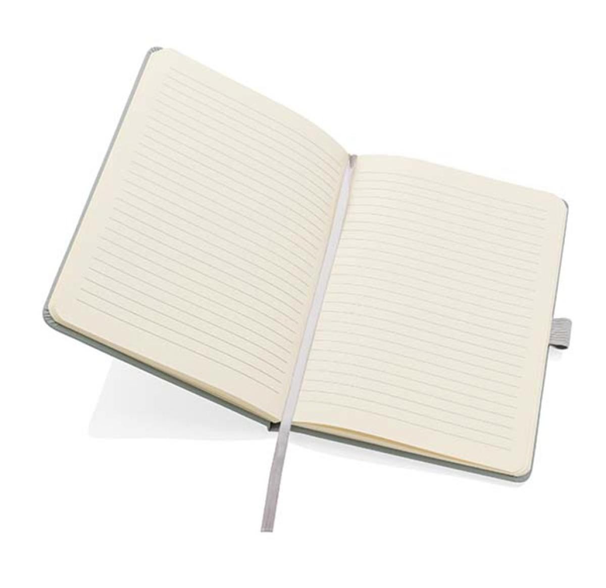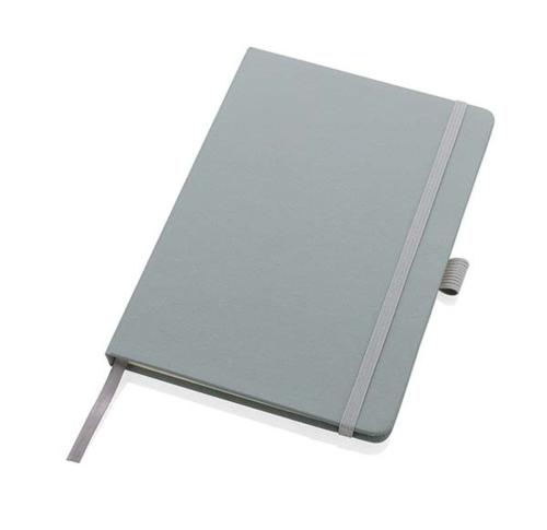 Jot down your thoughts and creative inspirations in this elegant A5 RCS certified recycled bonded leather hardcover notebook. Its stylish design boasts a beautiful finish, making it a sophisticated choice for your writing needs. The notebook is equipped with 80 sheets/160 pages of high-quality 70 gm/s white colored lined RCS certified recycled paper. It also features a vertical elastic band and a convenient pen loop, adding to its practicality and charm. Total recycled content: 67% based on total item weight.