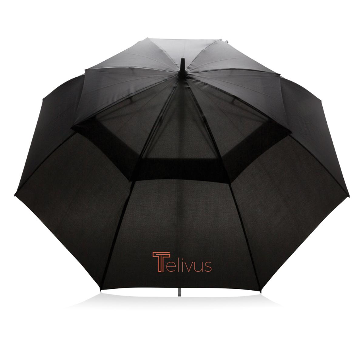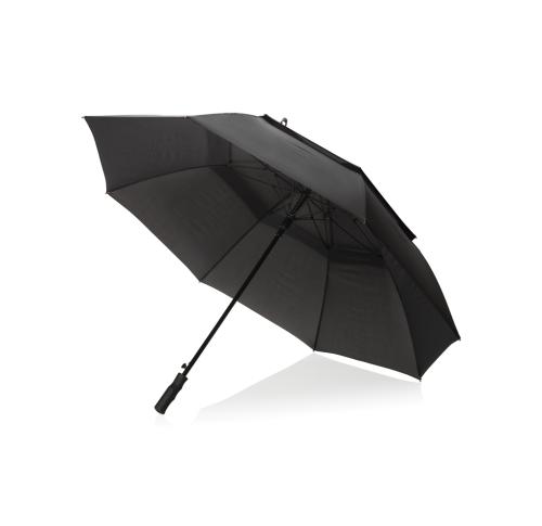 This Swiss Peak AWARE™ Tornado 30" storm umbrella is durable and reliable made with a metal frame, fibreglass ribs and a rubber handle. It has a storm proof function for harsh weather and comes with a Swiss Peak pouch for easy storage. Auto-open and manual close. Additionally, the umbrella features an AWARE™ tracer that validates the use of recycled materials, making it the better choice. Plus, 2% of proceeds from each Aware™ product sold are donated to Water.org.