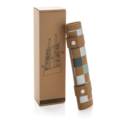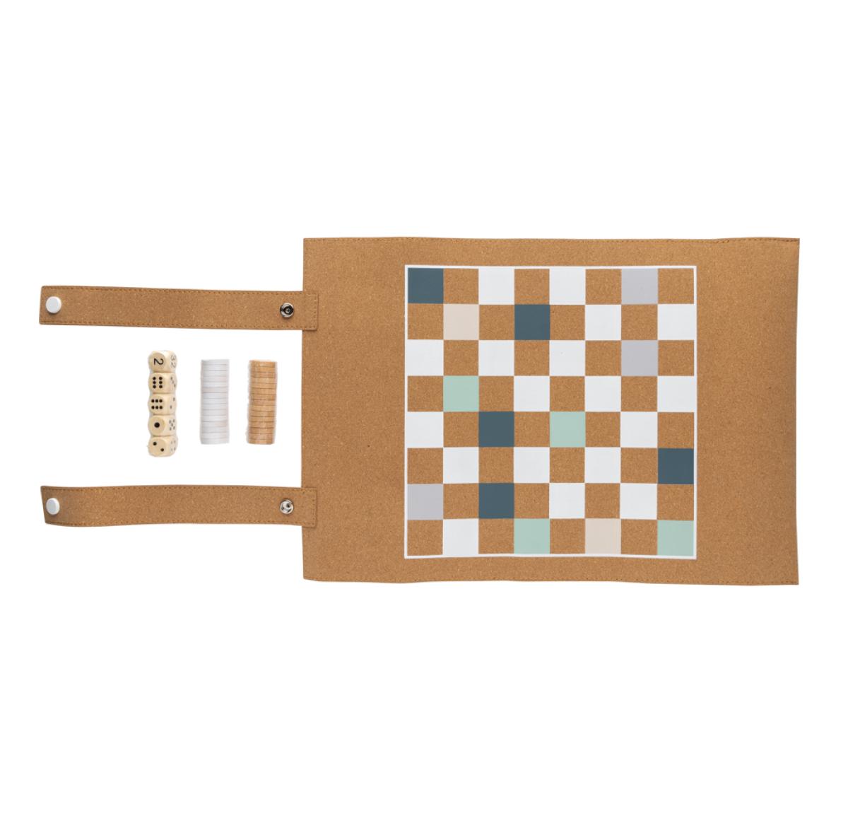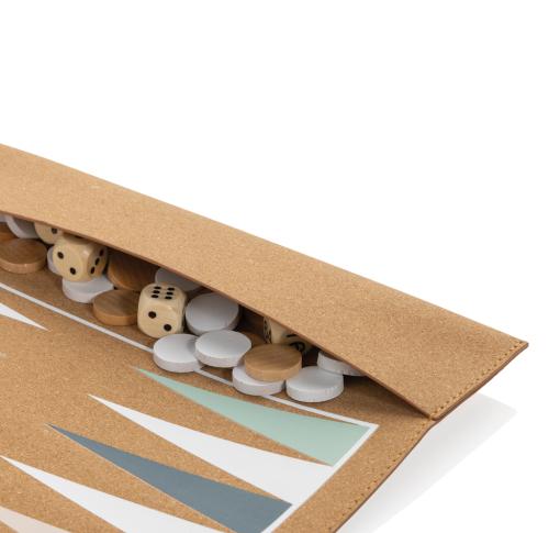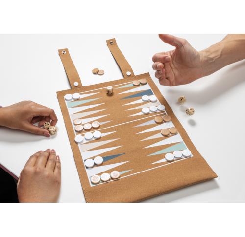 This foldable backgammon and checkers game set is a modern high-quality board game set featuring a FSC®-certified cork playing surface and playful colours. It is foldable for easy storage and transport, comes with playing pieces and a dice. With its classic design and durable playing pieces, it's a great option for anyone who loves these classic board games and wants a set that can be easily transported and stored.