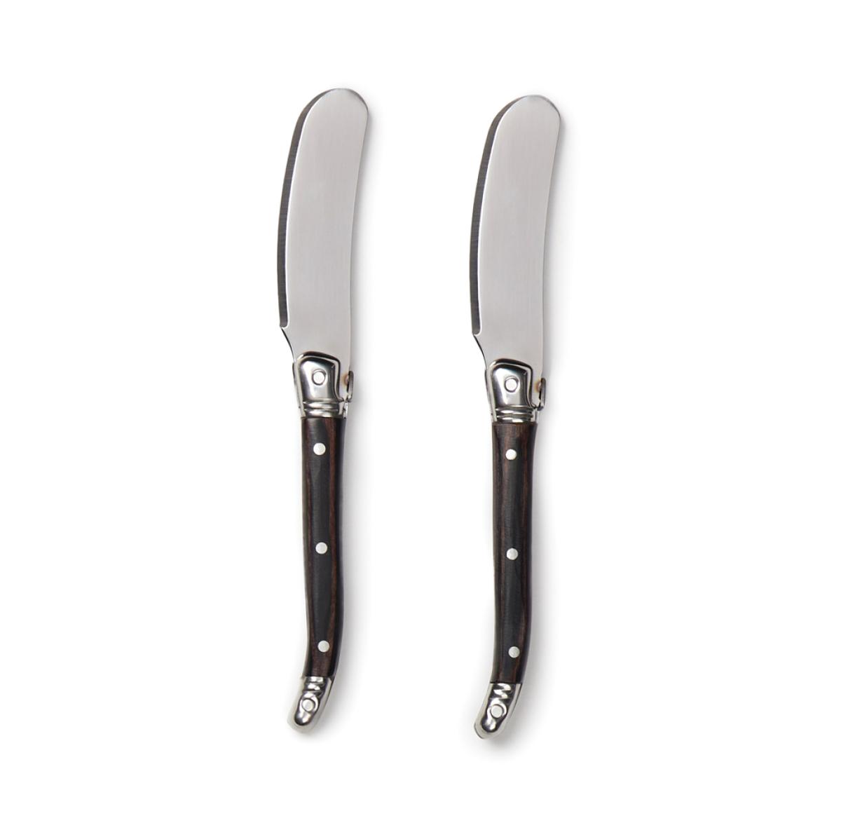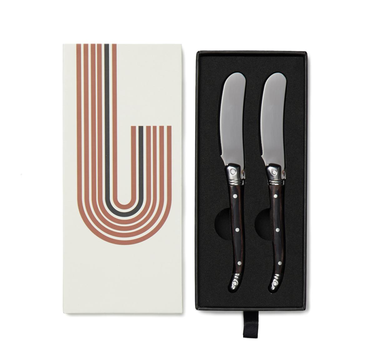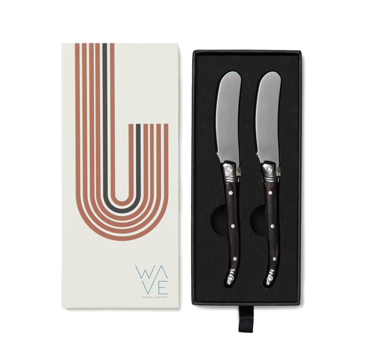 Exclusive 2-piece stainless steel butter knife set. These knives are perfect for spreading butter or jam on toast, bagels, muffins and more. The high-quality stainless steel blades ensure a smooth and effortless spread, while the sturdy pakka wood handles provide a comfortable grip. The set comes packed in an exclusive gift box, making it an ideal gift for any occasion.