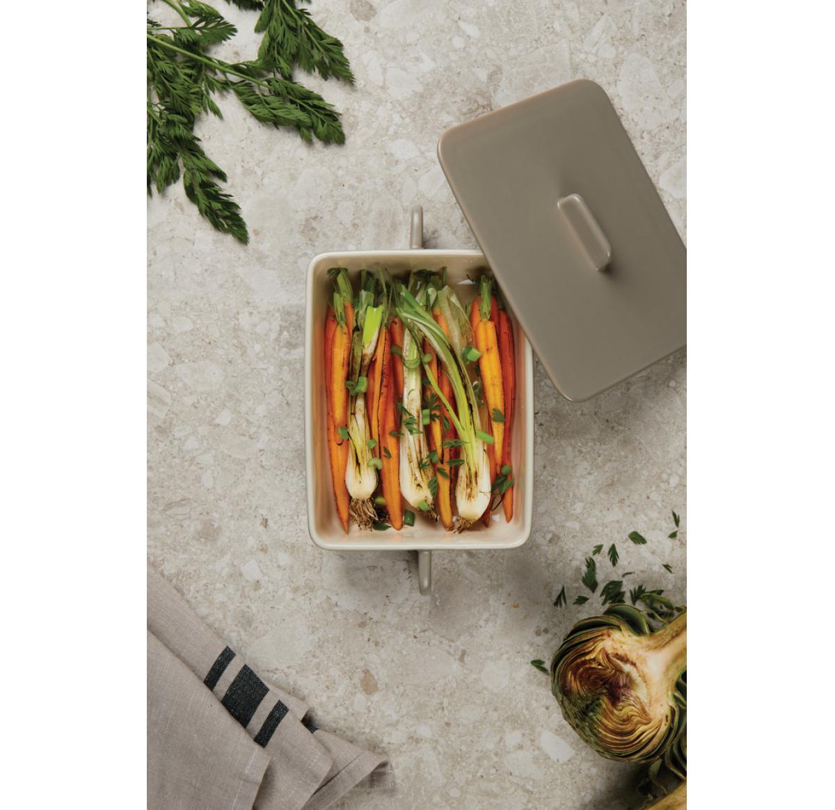 Versatile gratin dish with lid in stoneware - perfect for gratins, stews and casseroles. Oven and dishwasher safe for easy use and cleaning. Seal in flavours and aromas with the handy lid.