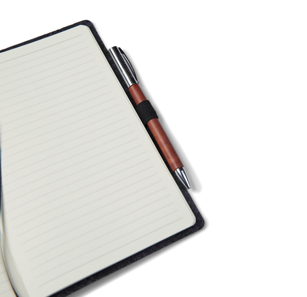 A5 notebook elegantly crafted from recycled felt, boasting a mélange effect and an integrated pen holder. Containing 80 sheets or 160 pages of 70 gsm recycled paper, its lined pages are ideal for any note-taking needs. Certified by GRS (Global Recycled Standard), GRS certification guarantees that the entire supply chain of the recycled materials is certified. The total recycled content is based on the overall product weight. This product contains 83% GRS-certified recycled paper and 7% GRS-certified recycled felt.