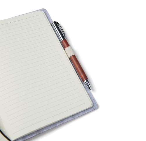 A5 notebook elegantly crafted from recycled felt, boasting a mélange effect and an integrated pen holder. Containing 80 sheets or 160 pages of 70 gsm recycled paper, its lined pages are ideal for any note-taking needs. Certified by GRS (Global Recycled Standard), GRS certification guarantees that the entire supply chain of the recycled materials is certified. The total recycled content is based on the overall product weight. This product contains 83% GRS-certified recycled paper and 7% GRS-certified recycled felt.