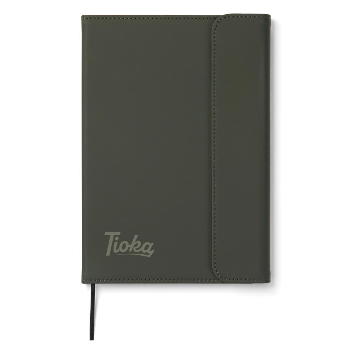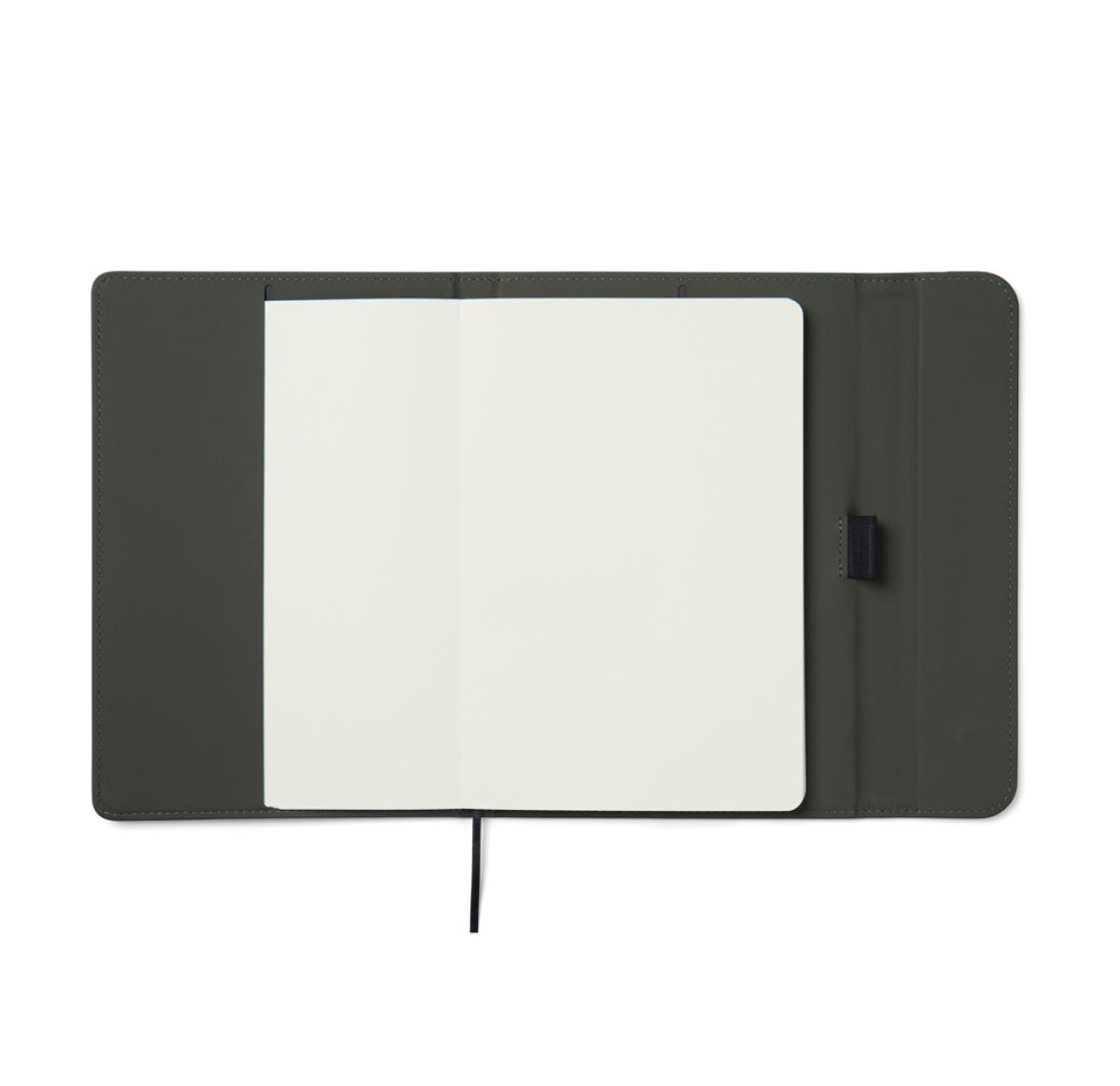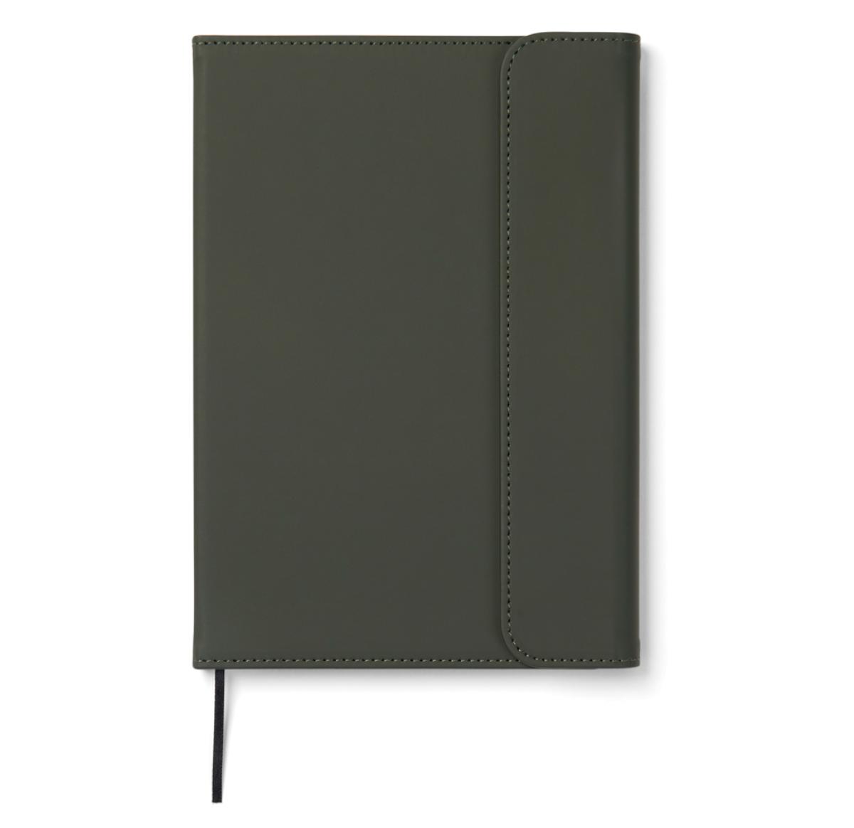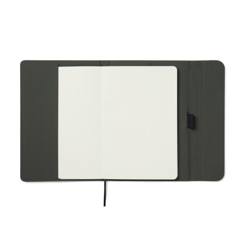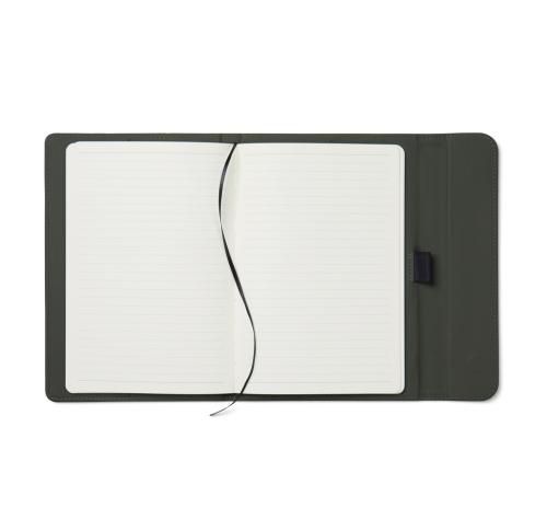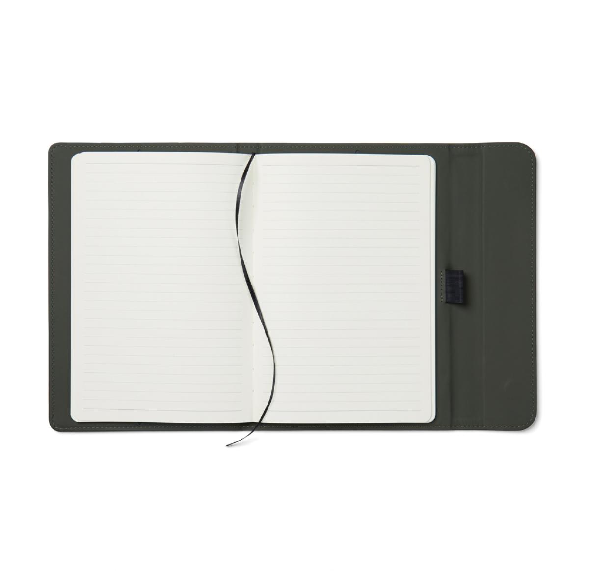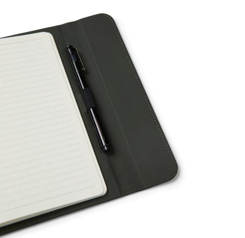Sleek A5 notebook in a clean touch. Its cover, crafted from 30% recycled matte PU, features a magnetic closure and an integrated pen holder. Within, 80 pages/160 sheets of 70 gsm lined recycled paper, suitable for all your note-taking needs. The paper insert can be replaced, allowing for prolonged use over time. Certified by GRS (Global Recycled Standard), GRS certification guarantees that the entire supply chain of the recycled materials is certified. The total recycled content is based on the overall product weight. This product contains 54% GRS-certified paper and 18% GRS-recycled PU.