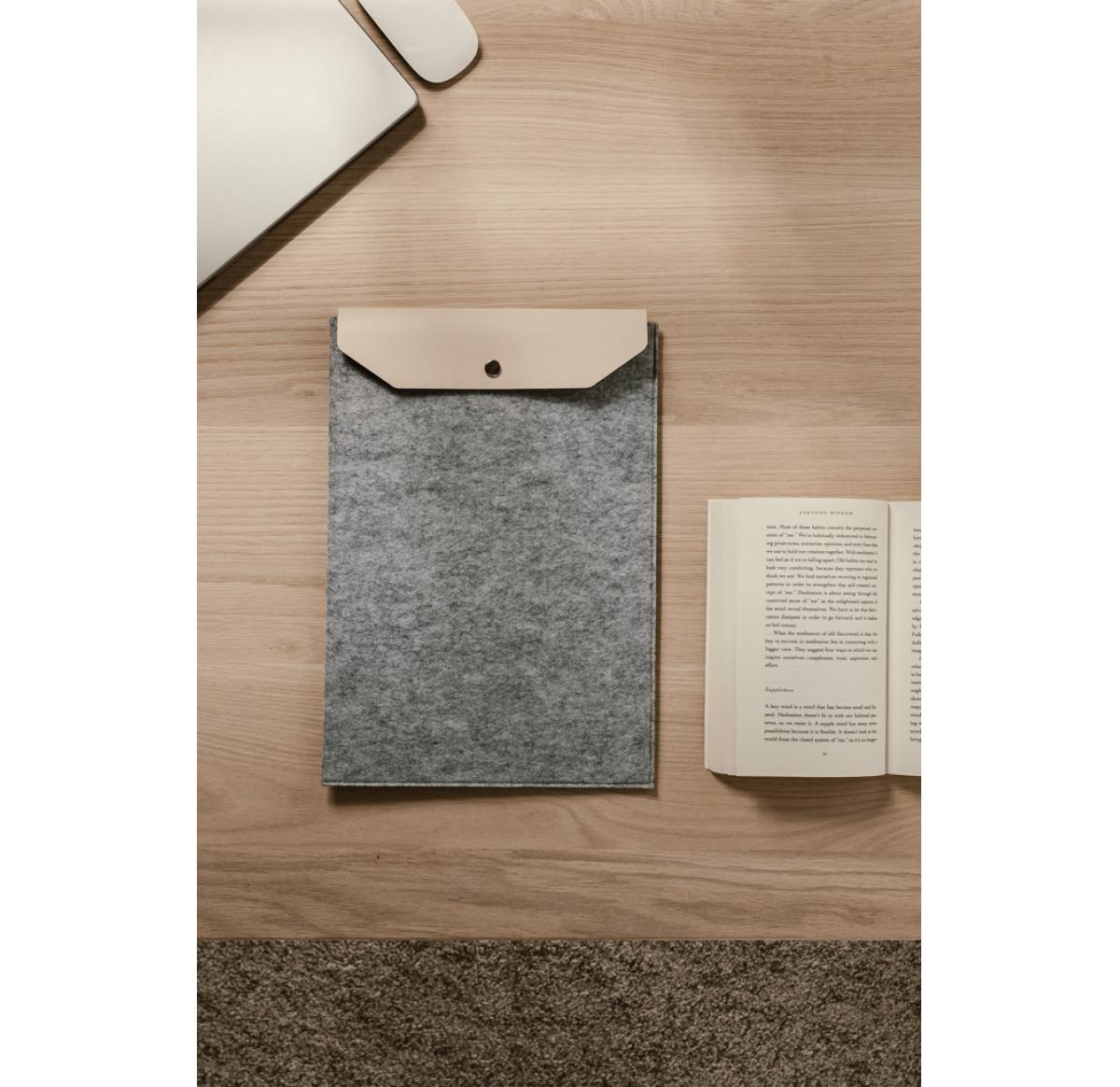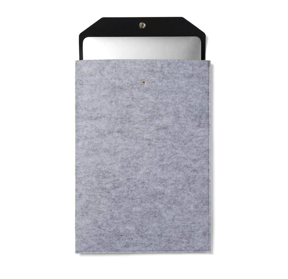 Laptop sleeve designed with a sleek, clean aesthetic using GRS recycled felt with a mélange effect. This sleeve effectively protects your computer from bumps and moisture. It features a PU flap opening for easy access and added elegance. The inner dimensions of this case are 34x2.5x24 cm, making it suitable for computers with an overall size of 14 inches. Please note that the dimensions of the display are not the same as the dimensions of the entire computer. Certified by GRS (Global Recycled Standard), GRS certification guarantees that the entire supply chain of the recycled materials is certified. The total recycled content is based on the overall product weight. This product contains 82% GRS recycled felt.