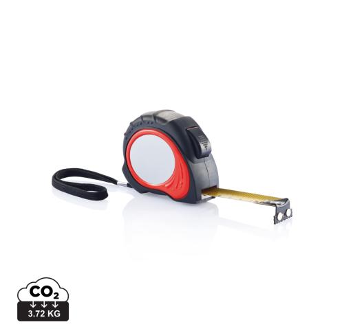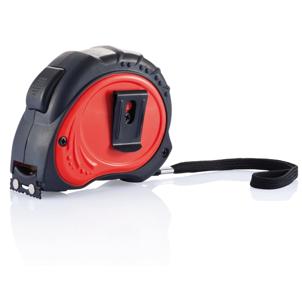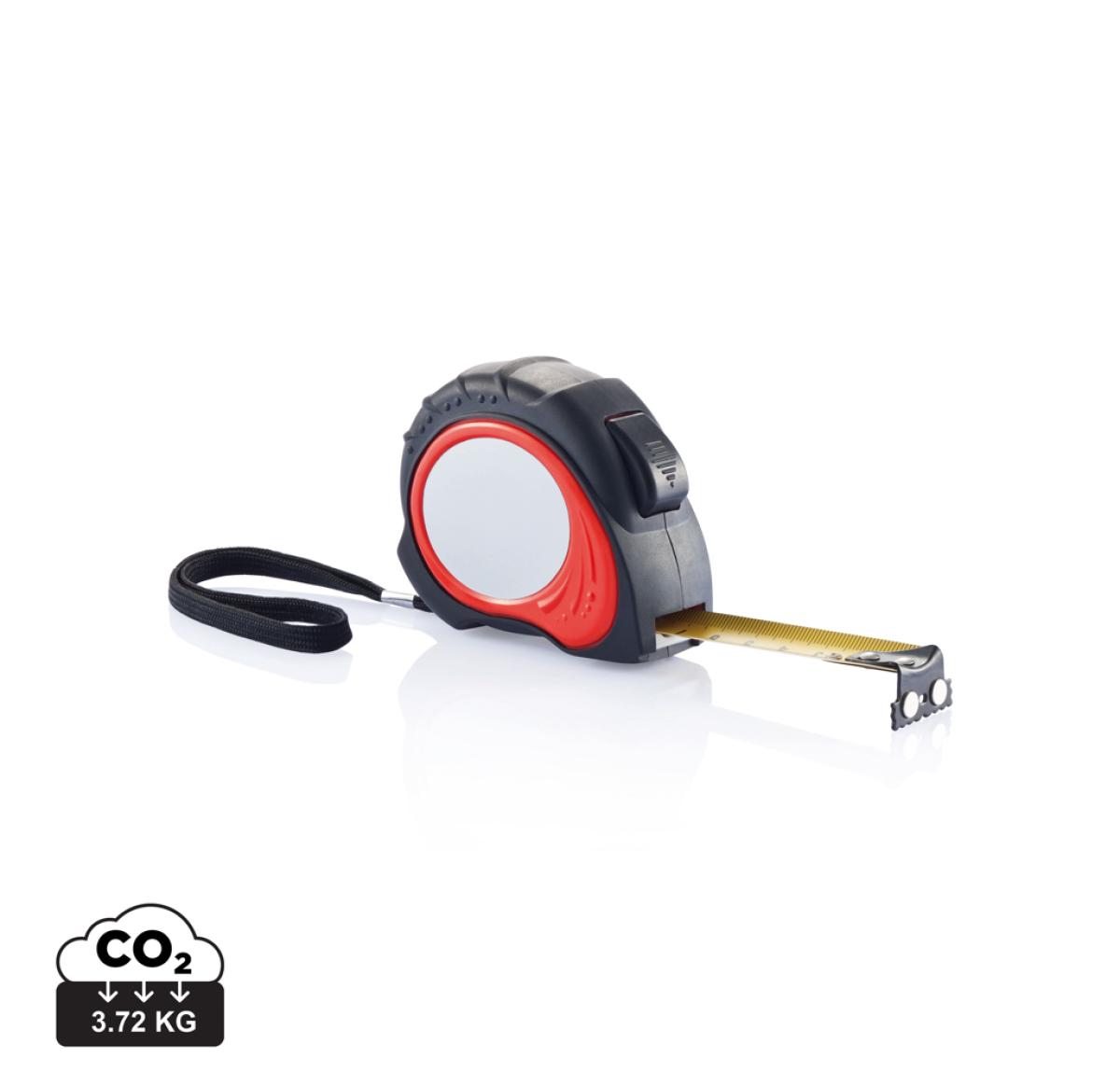 Measuring tape, red ABS case with black rubber grip, black belt clip, black stop button, black end hook with 2 strong magnets, yellow tape, matt silver PVC sticker at case.