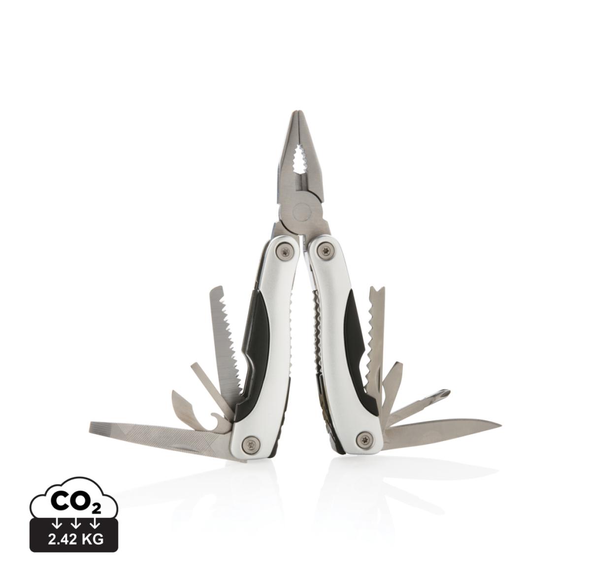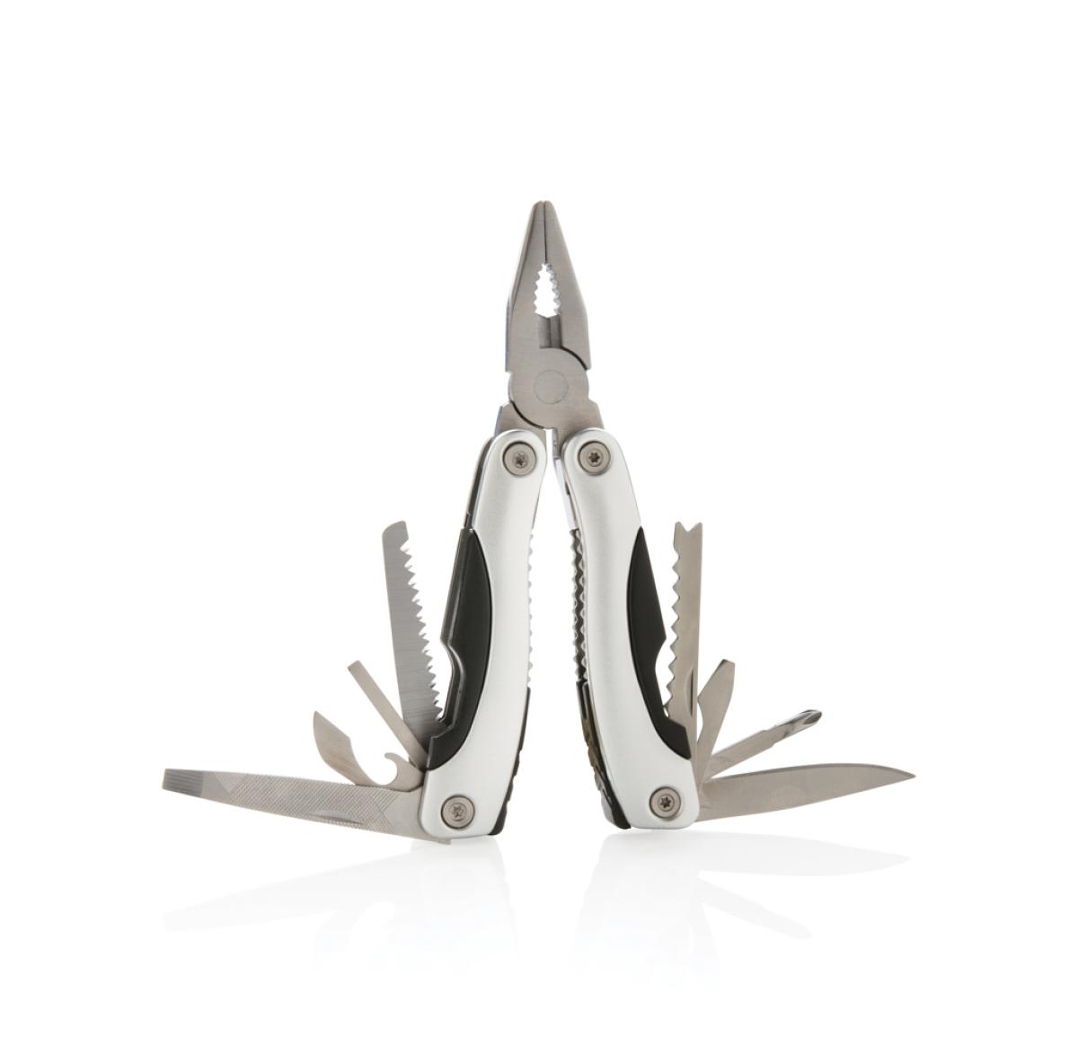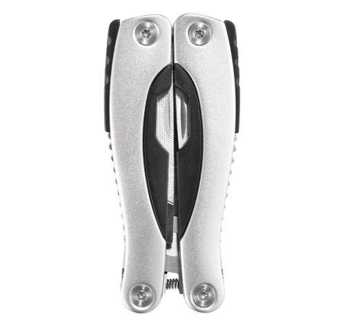 Aluminium multitool, handle with black details, 14 functions, packed in black 600D pouch.