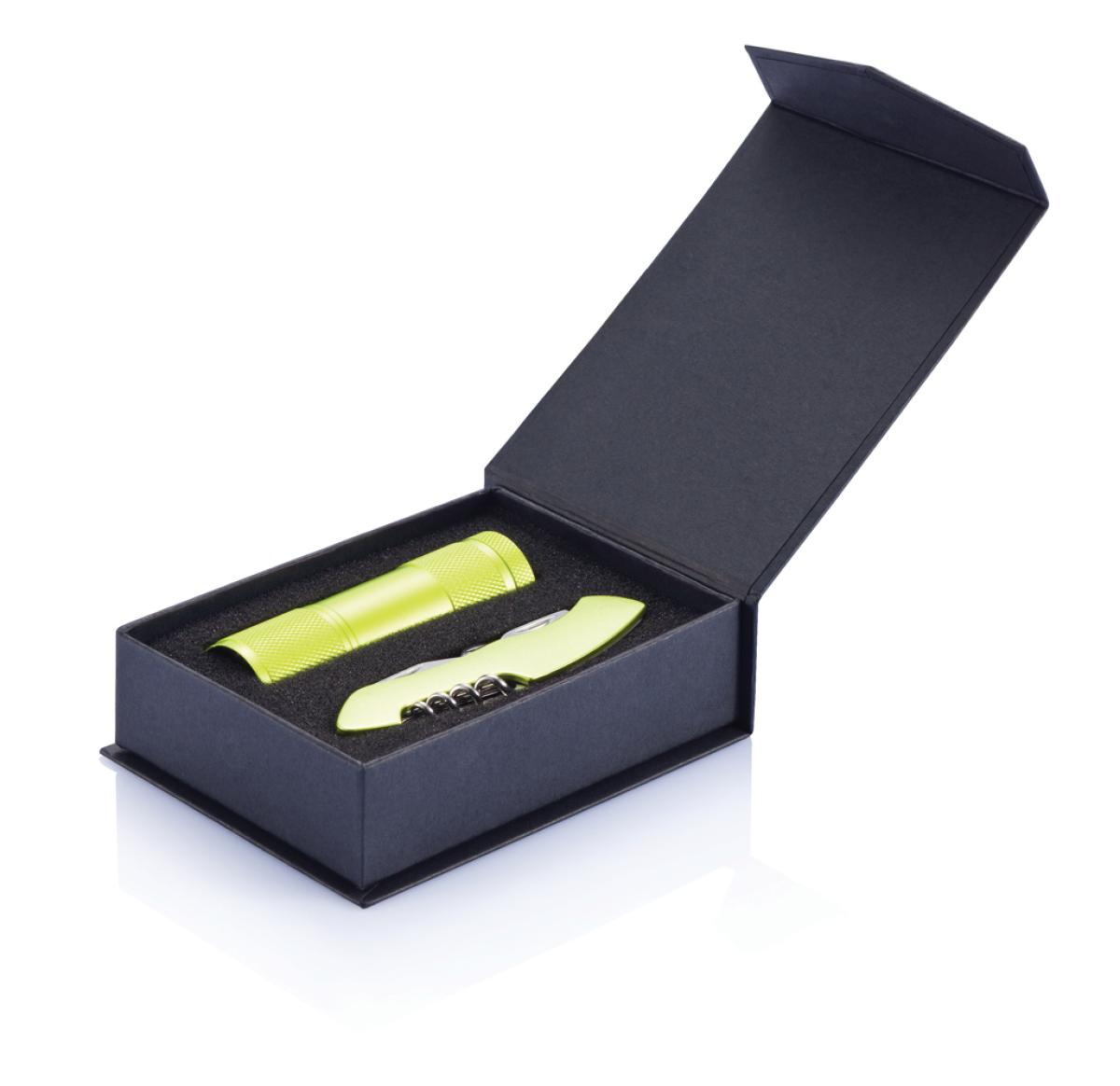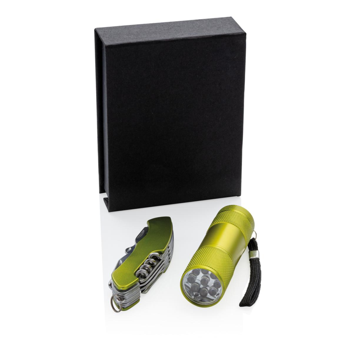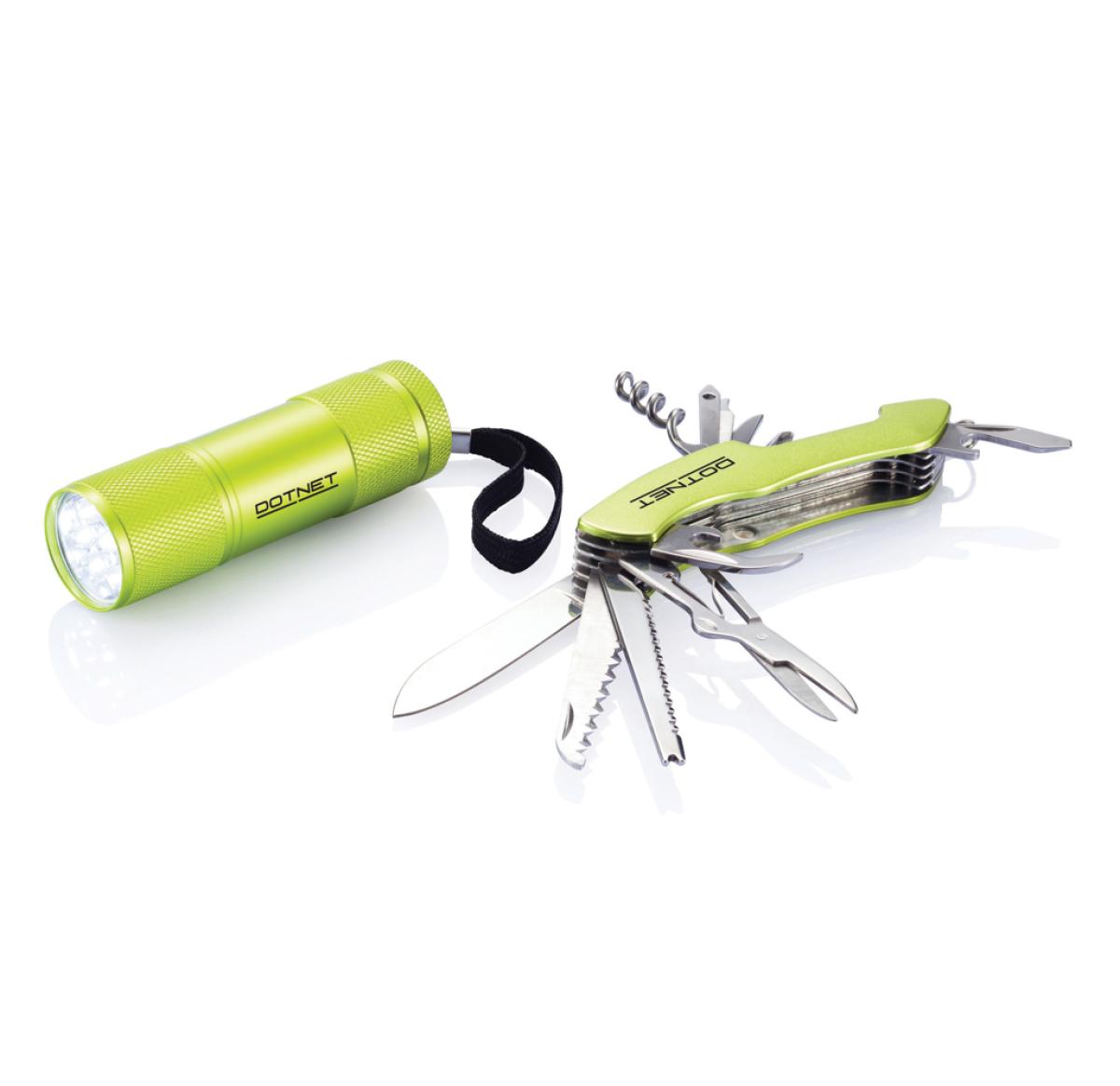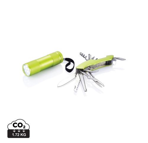 13 functions, aluminium matt anodised pocket knife with a big blade, saw, fish scaler, nail puller, scissors, bottle opener, slotted screwdriver, can opener, corkscrew, phillips screwdriver, small blade, nail file and awl plus the Quattro torch in alumini
