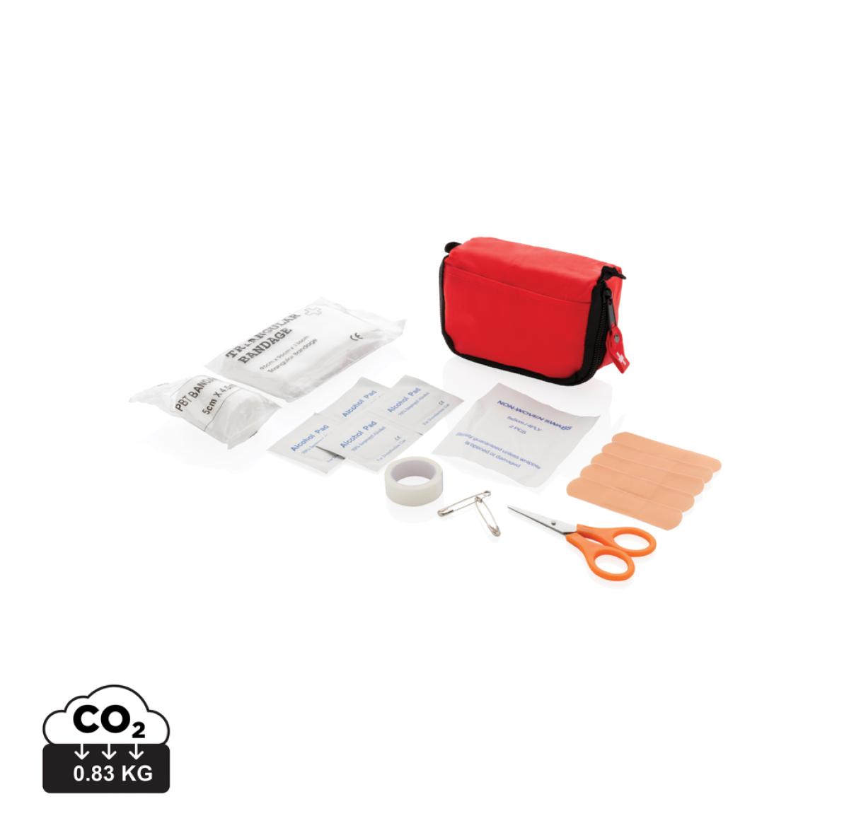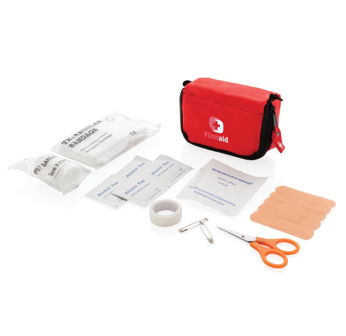 Pouch with one front pocket, one black zipped main compartment and belt loop on reverse side of pouch. Content: triangle bandage, PBT bandage, alcohol pad, plasters, scissors, pin and tape, conform EN 13485:2003.