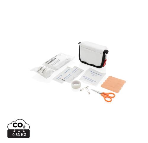 Pouch with one front pocket, one black zipped main compartment and belt loop on reverse side of pouch. Content: triangle bandage, PBT bandage, alcohol pad, plasters, scissors, pin and tape, conform EN 13485:2003.