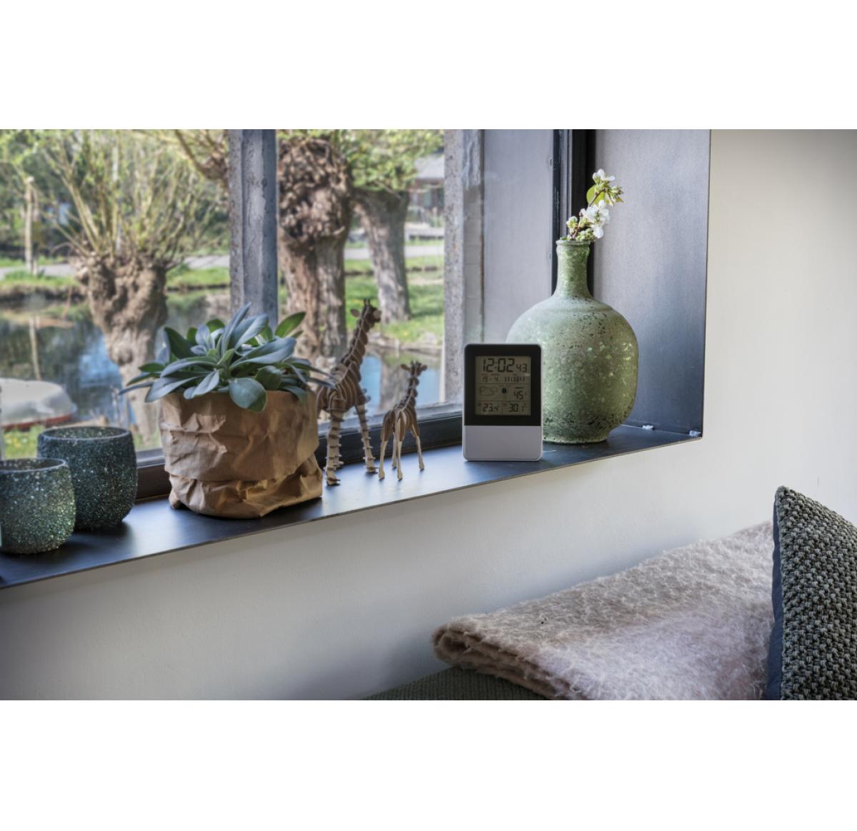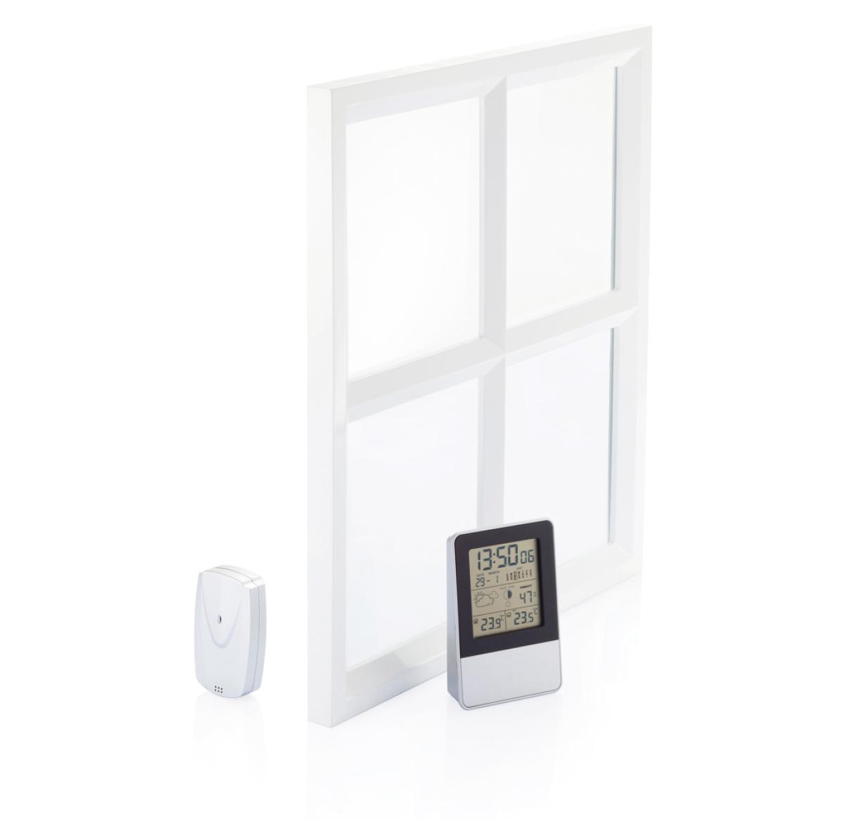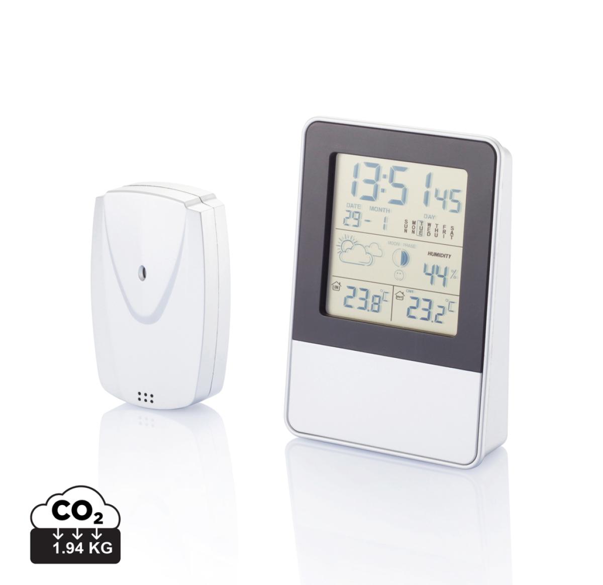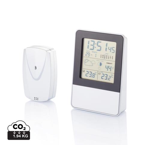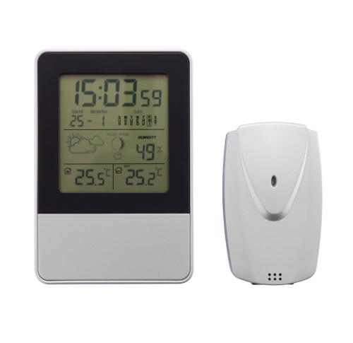 In/outdoor weather station with LCD screen and special outdoor sensor. Functions: Time and calendar, indoor/outdoor temperature, weather forecast, humidity and alarm.