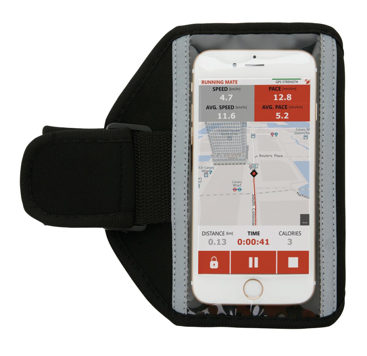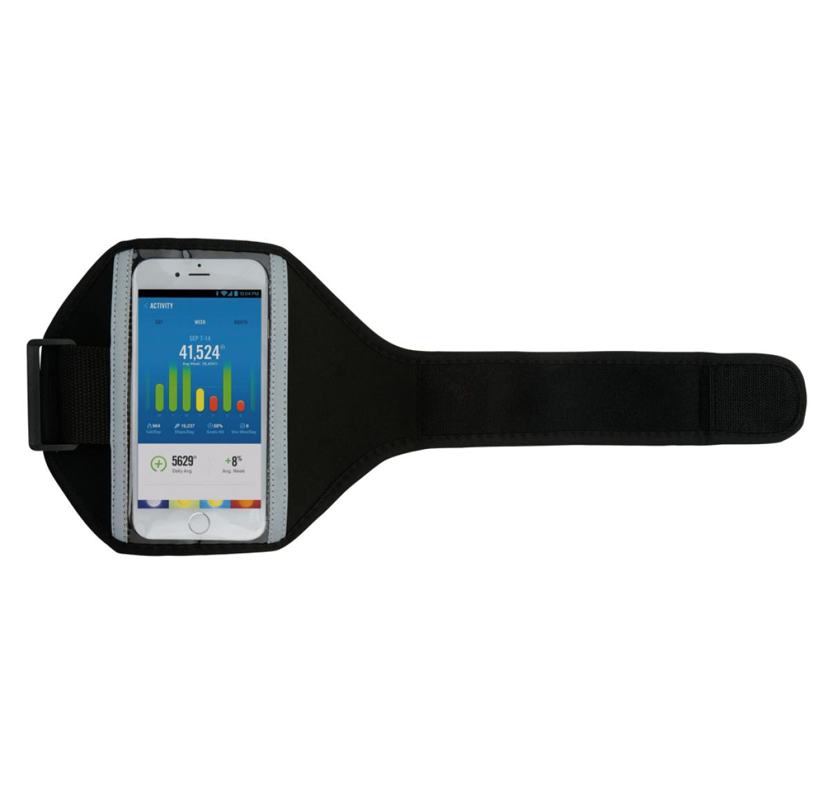 Neoprene sport armband that fits all common mobile phones (Iphone 5, 6, 7, 8, X and Xs' Samsung S6, S7, S8 and S9) so you can take them on your run or other activity. The front has a reflective strip around the window for extra visibility in the dark. The