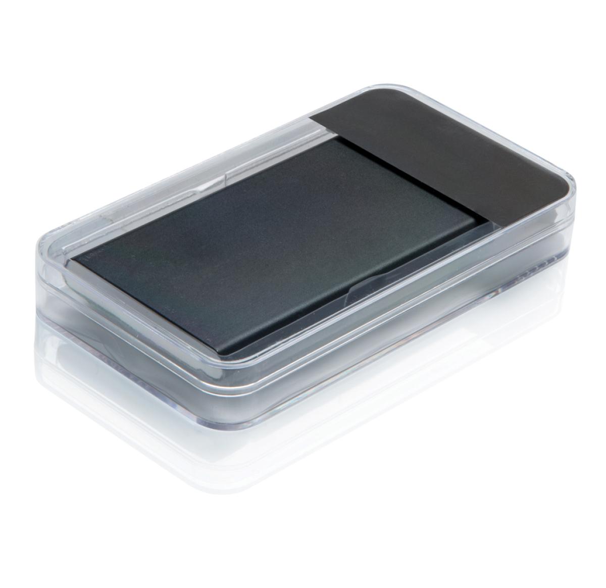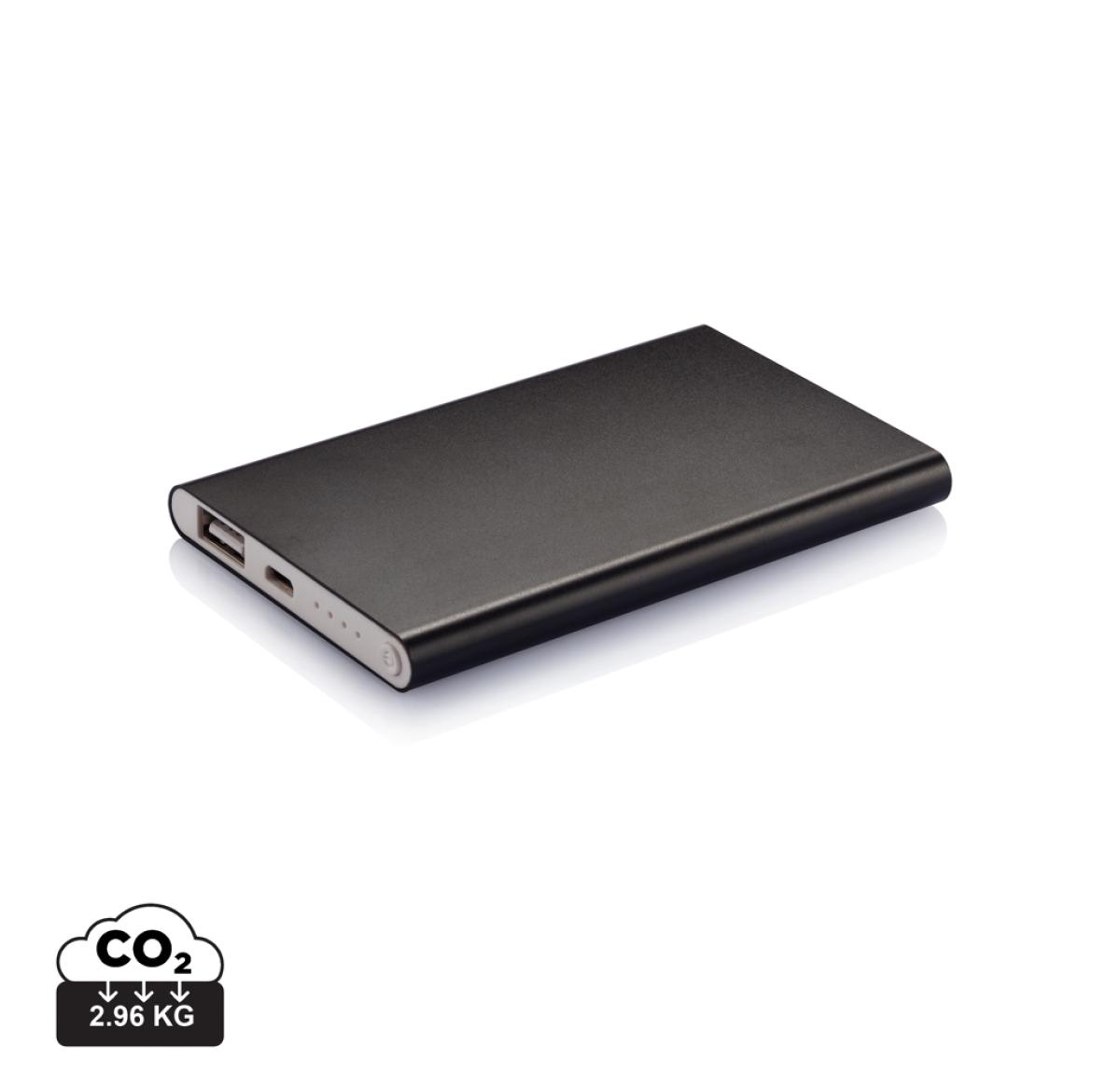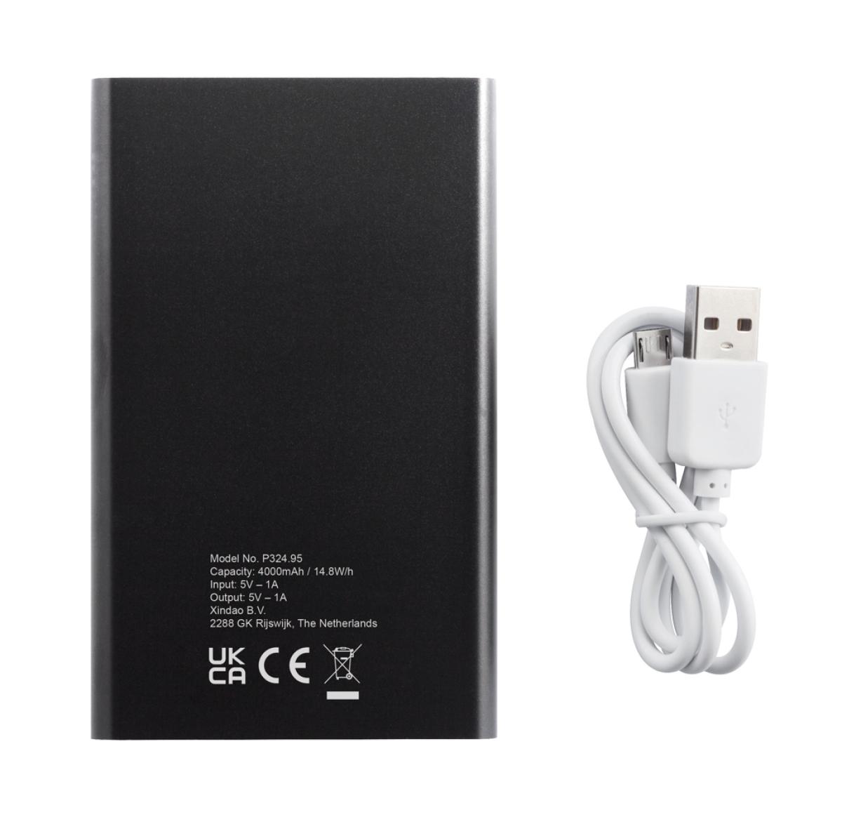4000 mAh aluminium slim powerbank with high quality lithium polymer battery. Including on/off button and remaining capacity indicator. Packed in transparent gift box. Output 5V/1, input 5V/1 A. Including micro USB cable.