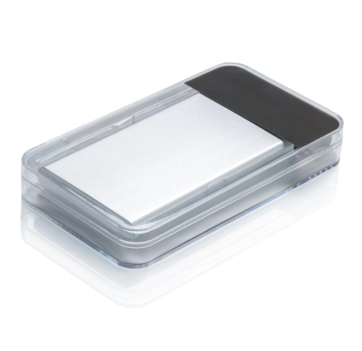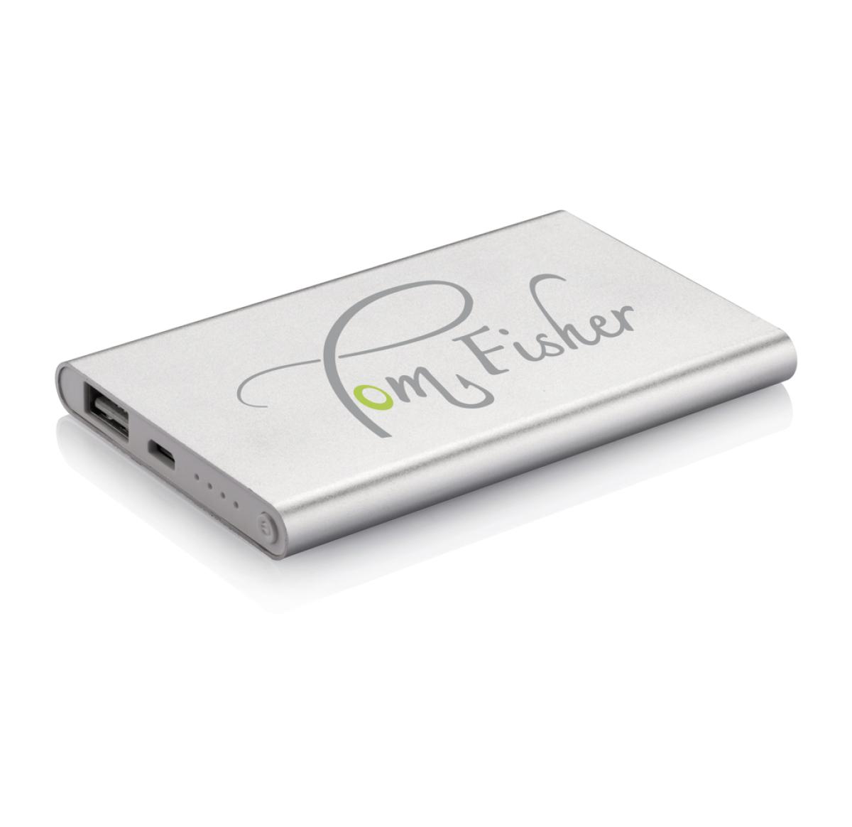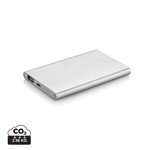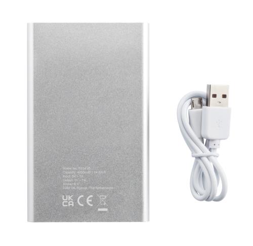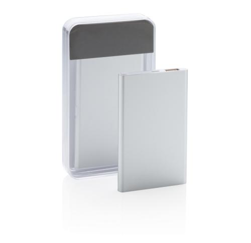 4000 mAh aluminium slim powerbank with high quality lithium polymer battery. Including on/off button and remaining capacity indicator. Packed in transparent gift box. Output 5V/1, input 5V/1 A. Including micro USB cable.