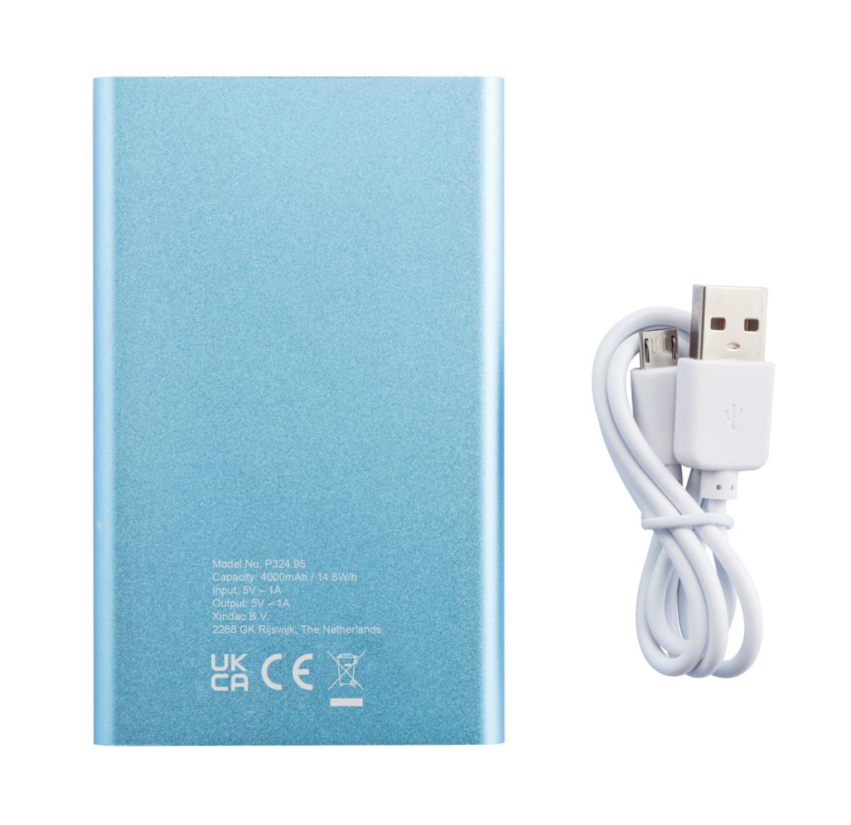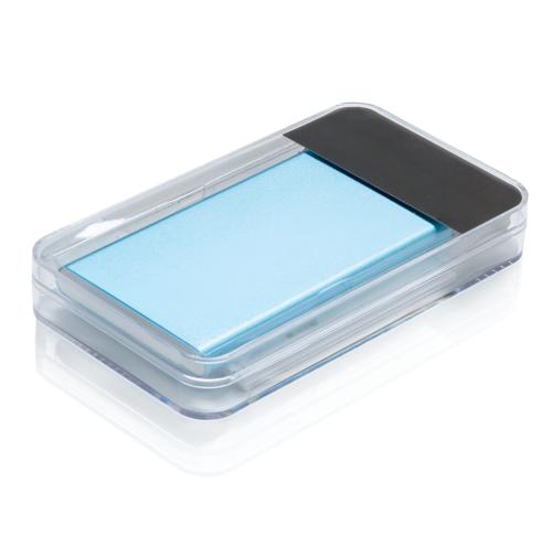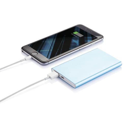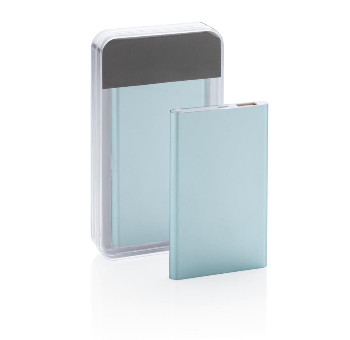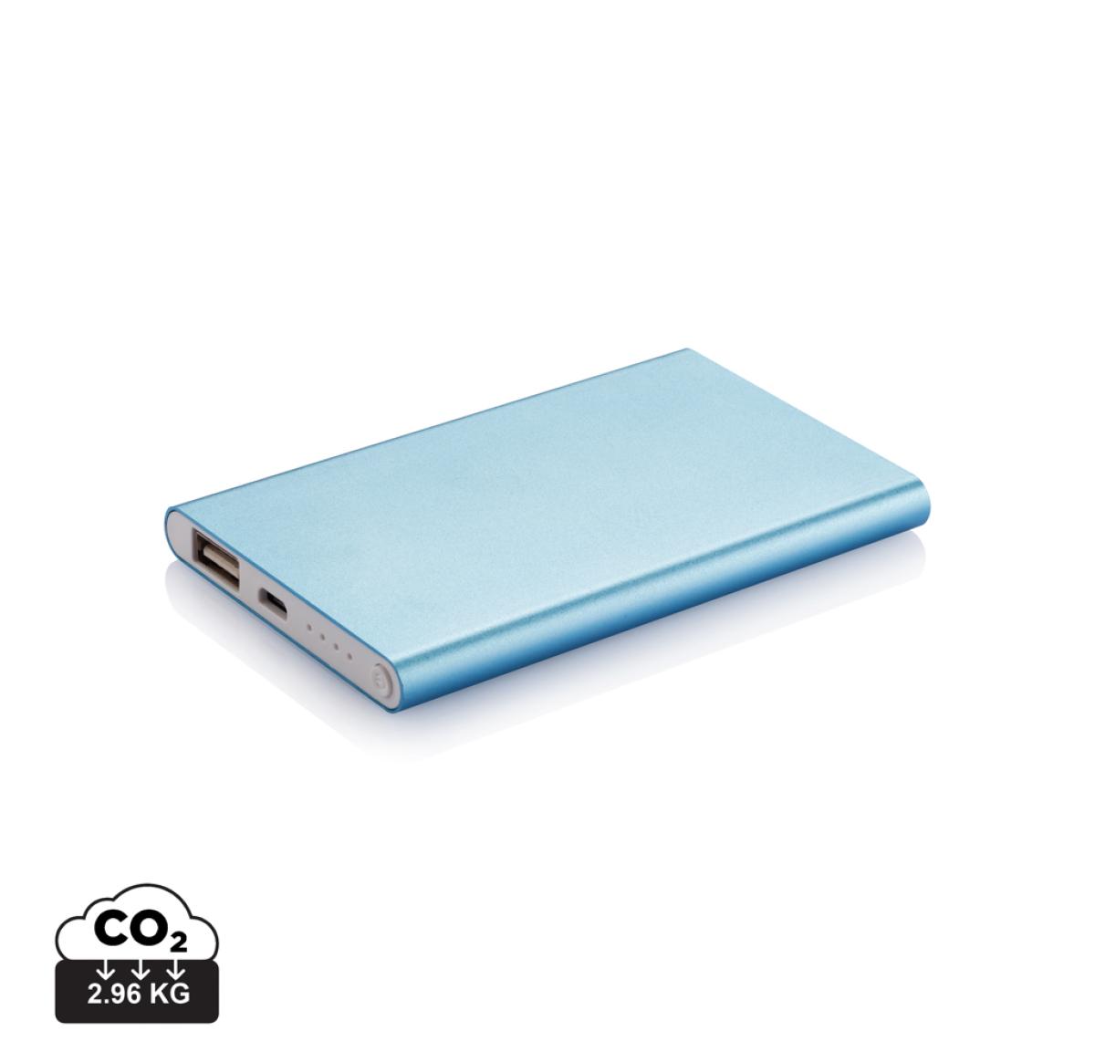 4000 mAh aluminium slim powerbank with high quality lithium polymer battery. Including on/off button and remaining capacity indicator. Packed in transparent gift box. Output 5V/1, input 5V/1 A. Including micro USB cable.