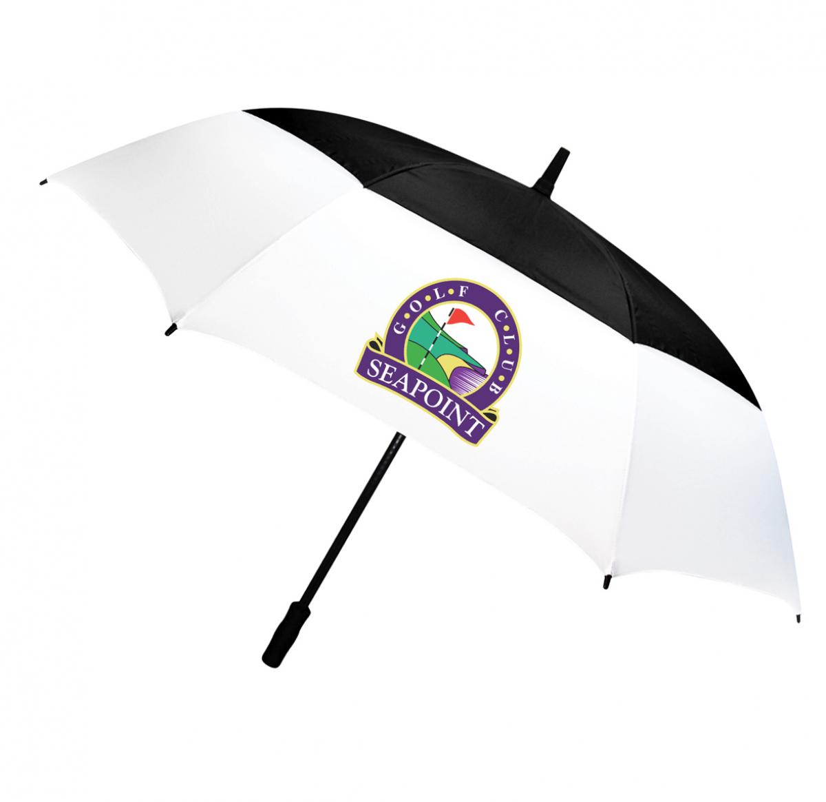 Vented canopy to allow better wind flow. Fibreglass frame and storm proof ribs. Push button opening mechanism. Soft touch handle with removable ball marker in the handle.
