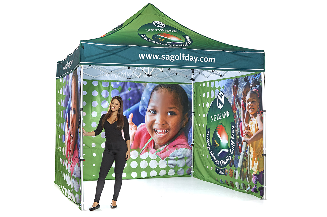 Custom design. Full colour digital print. Can be erected and collapsed in less than 2 minutes. Strong aluminium frame designed for professional use. Heavy duty carry bag with handle & wheels fastening pegs. Easy to transport