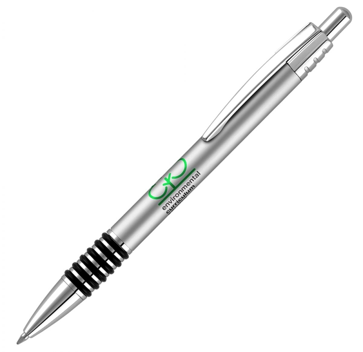 Retractable aluminium ballpen with a distinctive rubberised grip and chrome trim.