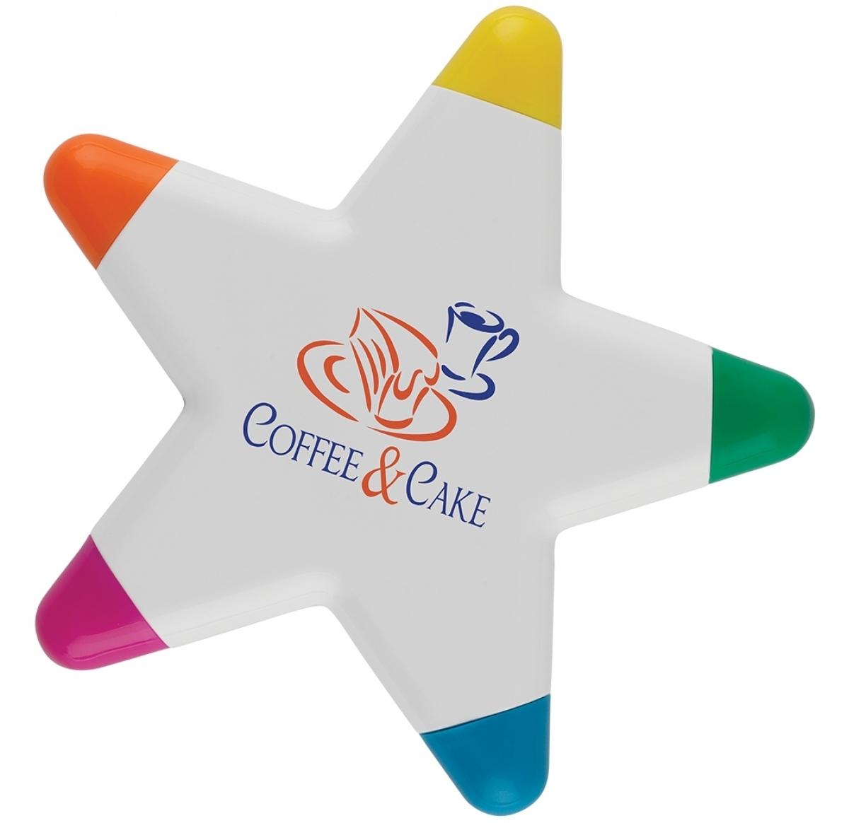 Star shaped highlighter with 5 popular highlighter colours. Each coloured cap corresponds with the refill colour. Available with both line and full colour printing.