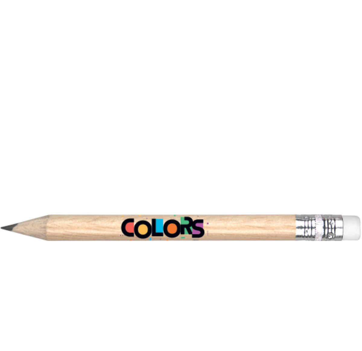 Half length pencil with a silver ferrule and White eraser. Suitable for single colour printing only. Always supplied sharpened at no additional cost.