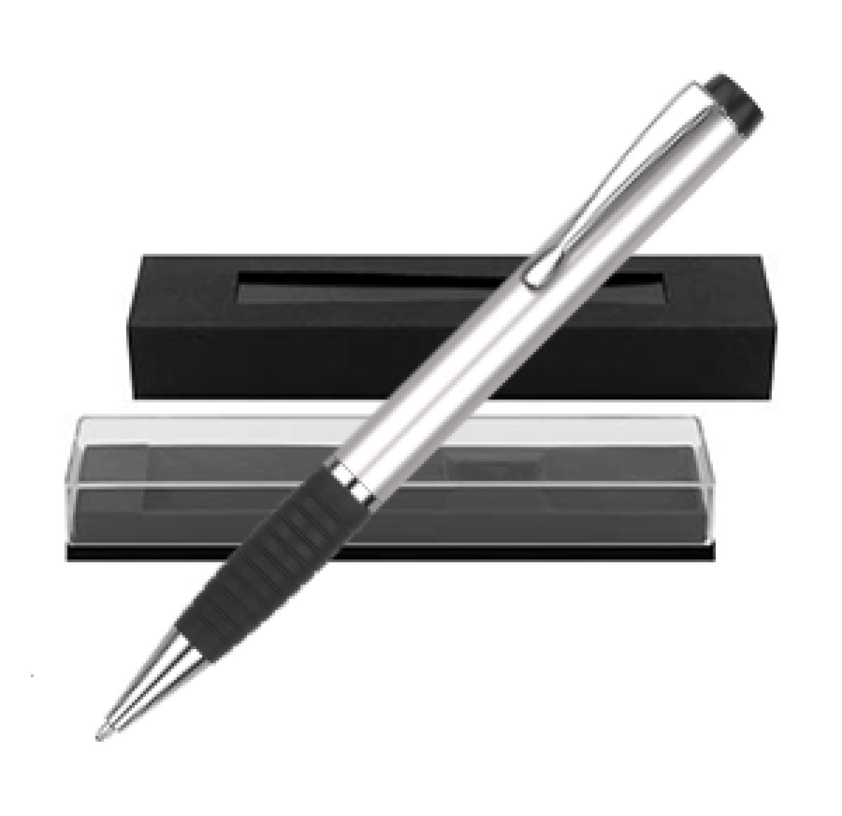 Twist-action ballpen with chrome trim and black ribbed rubber grip. Metal ink refill as standard. Supplied with Presentation Box. Also known as Warwick Ballpen.