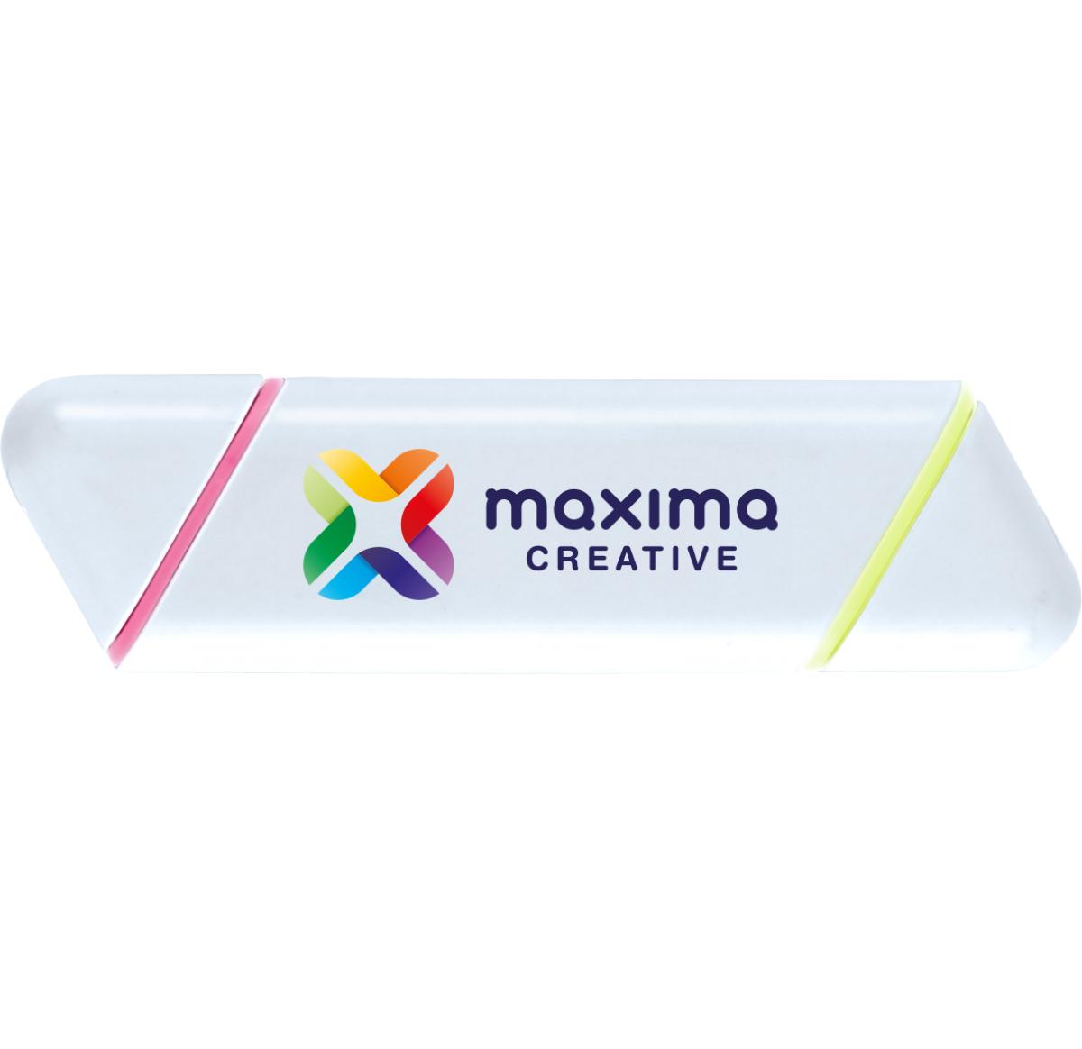 Double ended highlighter with pink and yellow nibs. Suitable for spot colour, full colour and UltraHD printing. Available in: White