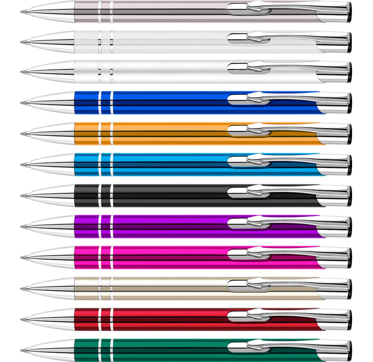 Best-selling aluminium ballpen with anodised finish and chrome trim. The unique positioning of the chrome rings gives this pen a much larger print area than standard. Please order a sample as colours can vary batch to batch. Available in: White