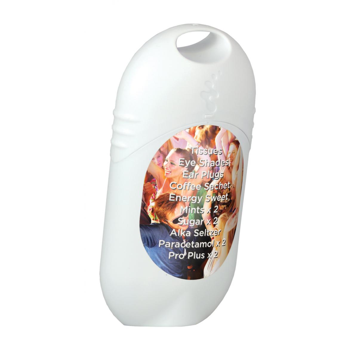 This promotional kit is the ideal pack for when your customers need a little ‘pick-me-up’. Contents: Tissues, eye shades, ear plugs, coffee sachet, energy sweet, 2 x mints, 2 x sugar, Alka Seltzer, 2 x paracetamol, 2 x Pro Plus
