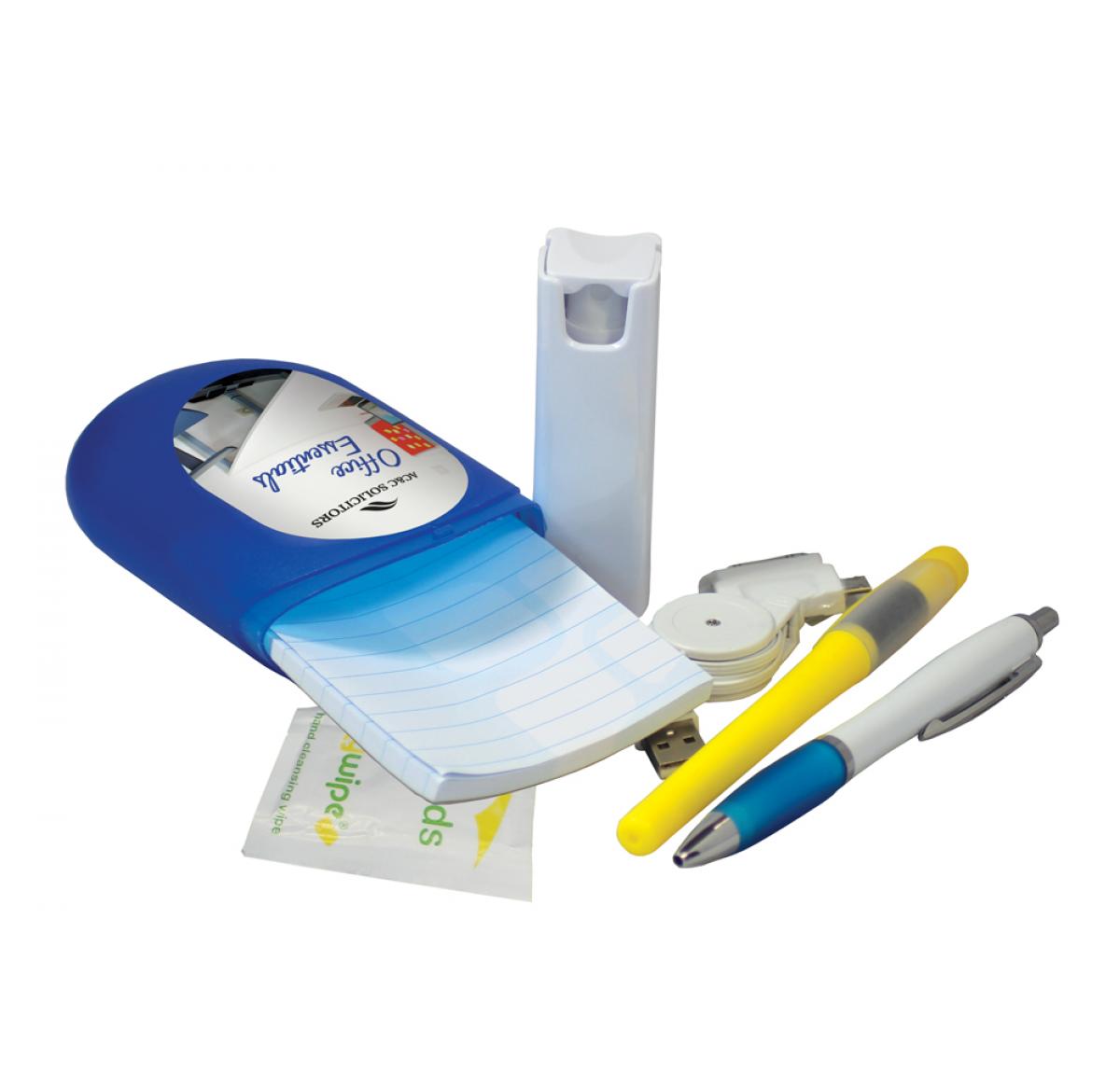 This practical promotional pack will become an absolute essential in your customer’s office. Contents: Spray cleaner, Extending Charger Cable, Curvy Ballpen, A7 Desk-Mate Pad, Splash Highlighter, antibacterial wipe