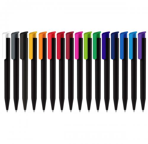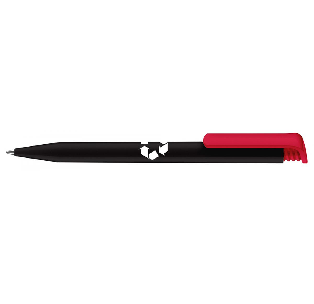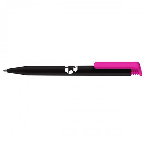Evergreen and million seller. Ballpen with opaque high-gloss finish black barrel made from 95% recycled material, and coloured clip. Fitted with large capacity Magic Flow refill.