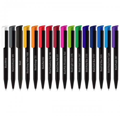 Barrel: Black. Clip: White, Anthracite 445, Black, Honey Yellow 7408, Orange 151, Red 032, Strawberry Red 186, Cherry Red 201, Rhodamine Red, Light Green 376, Vivid Green 347, Navy Blue 2735, Dark Blue 2757, Full Blue 2935, Hex. Cyan, Purple 267